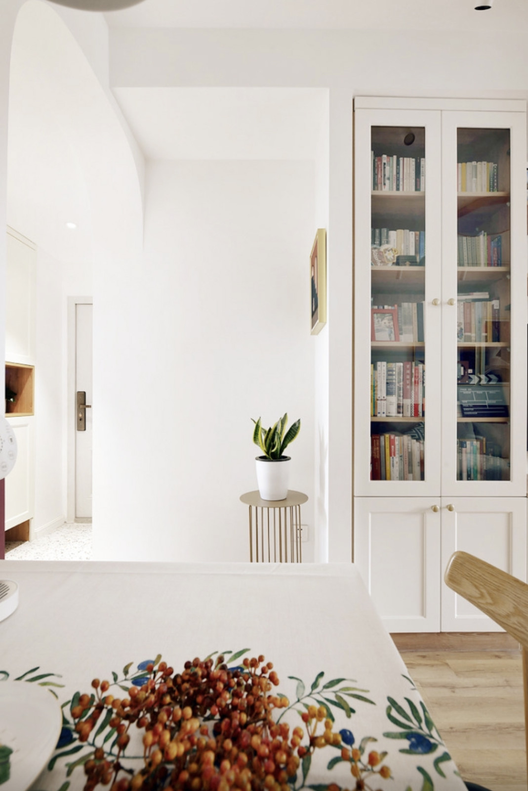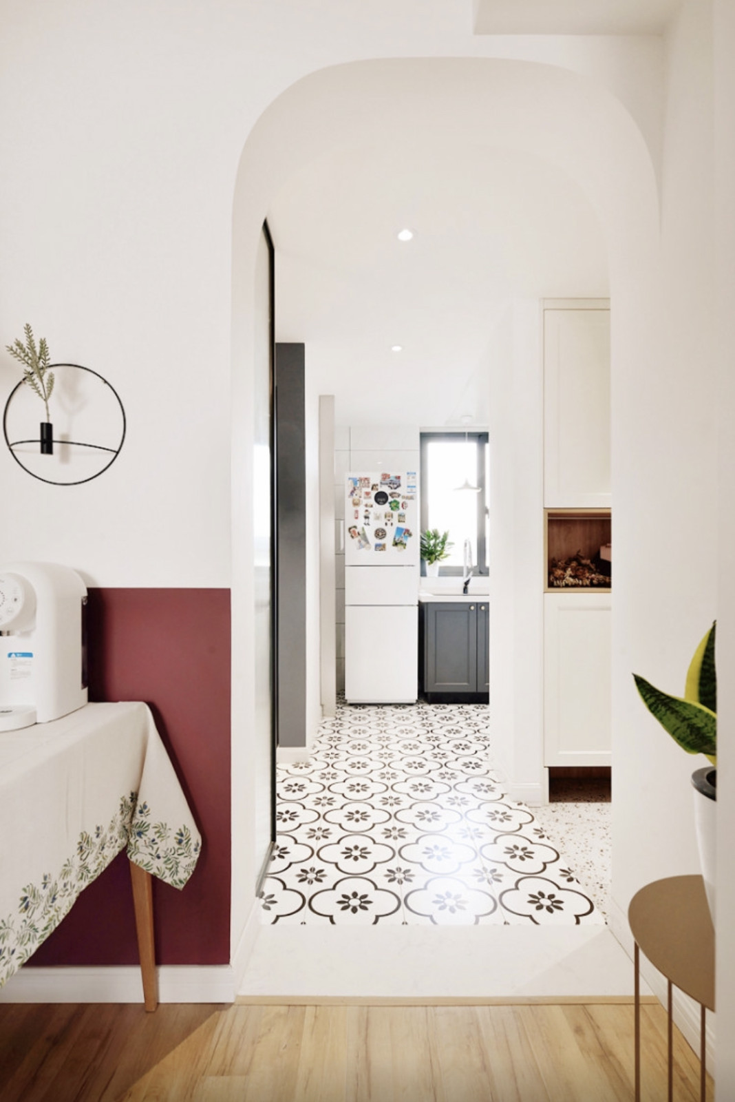 干區(qū)的隔壁就是餐廳,客餐廳通往廚房和玄關(guān)的門洞采用了圓弧角拱形設(shè)計(jì),這也是在北歐風(fēng)格中的一種設(shè)計(jì)表現(xiàn)形式,業(yè)主本人經(jīng)常世界各地旅游所見(jiàn)到這類拱形風(fēng)格設(shè)計(jì)也非常喜歡。