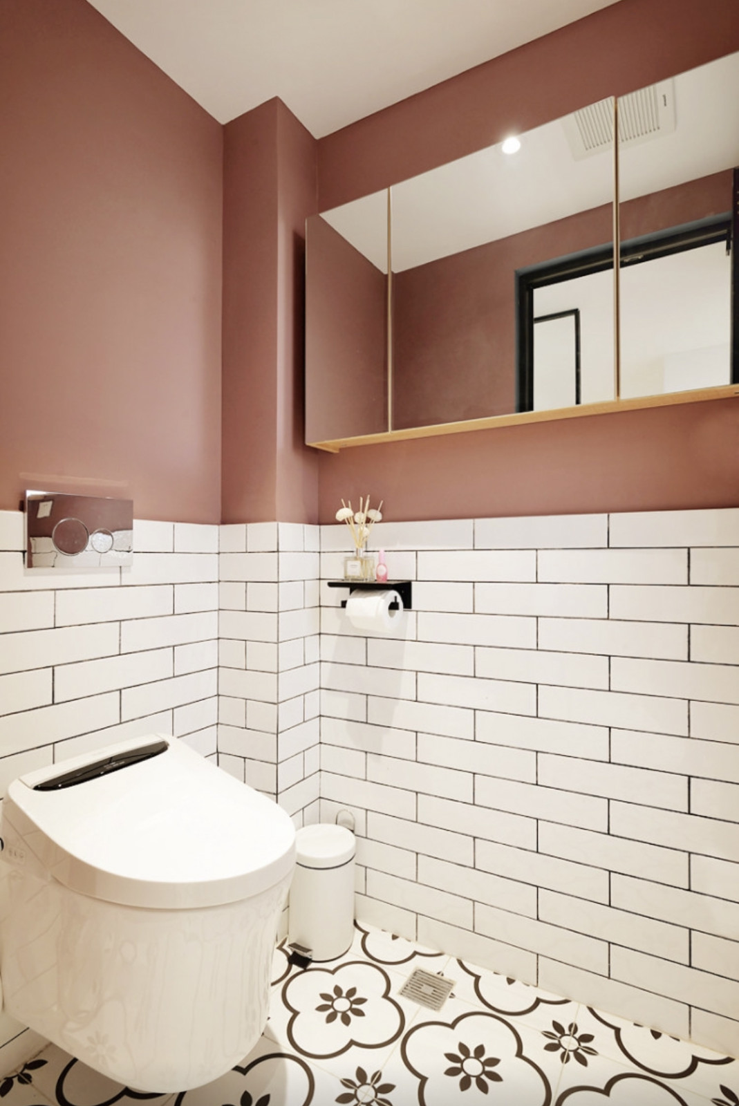 衛(wèi)生間的地磚仍然是白色小花磚,墻磚用了75*300的小白磚,墻面上部配色用藕粉色,墻上安裝了一個(gè)1000*140*600的原木色的全鏡柜,增加了一個(gè)收納空間,同時(shí)也讓狹小的衛(wèi)生間得到視覺(jué)上的延展。