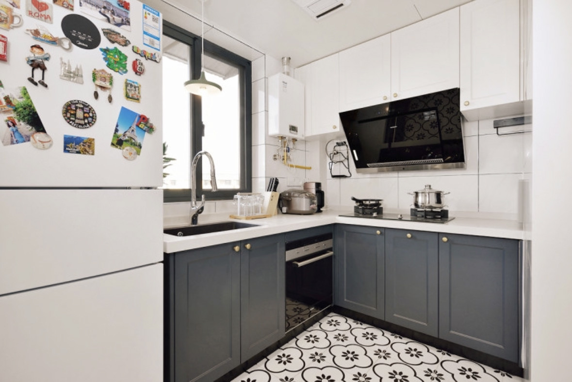 在玄關(guān)鞋柜的另一側(cè)就是廚房,廚房是開(kāi)放式設(shè)計(jì),沒(méi)有做門。櫥柜臺(tái)面是L型動(dòng)線設(shè)計(jì),從冰箱到水槽,臺(tái)面切配,直到燃?xì)庠钆腼儏^(qū)流水式操作。