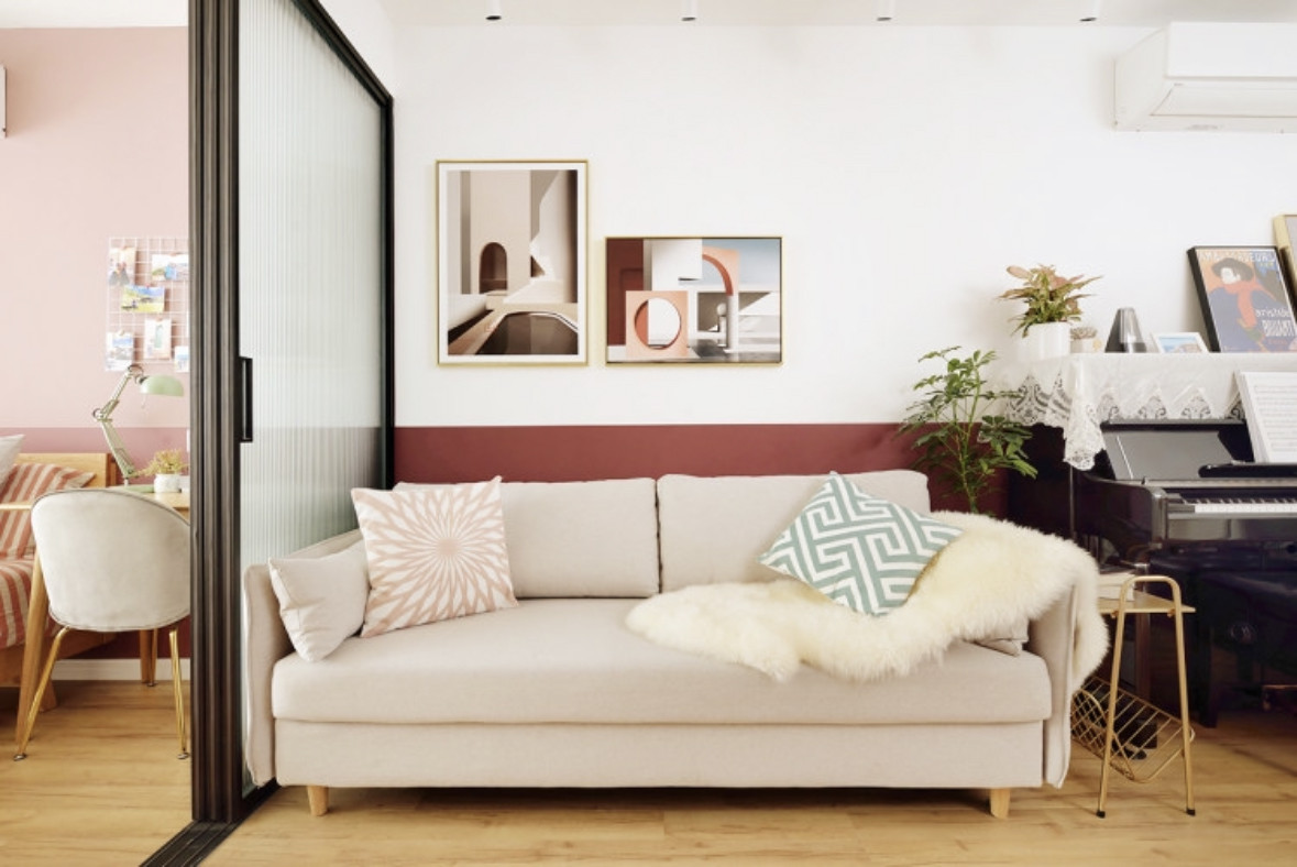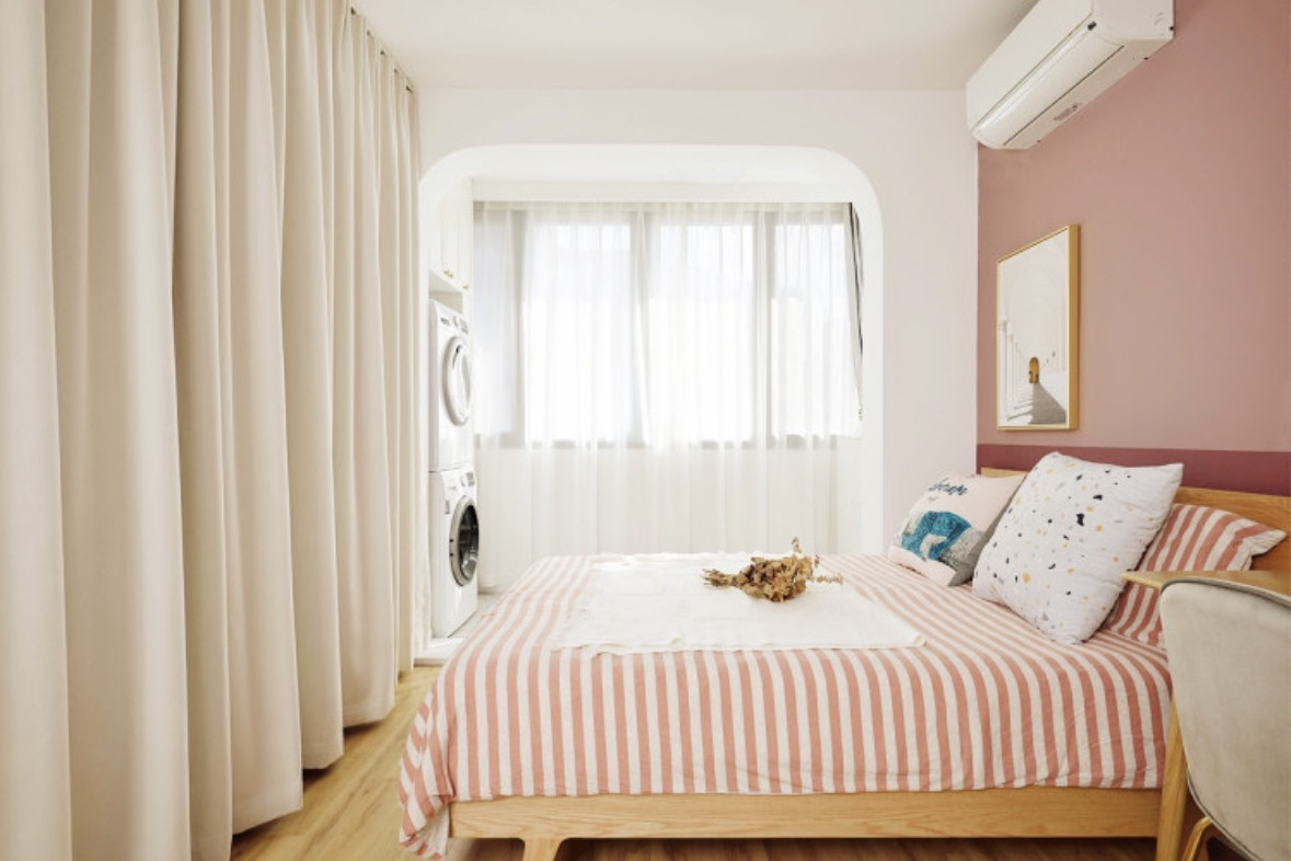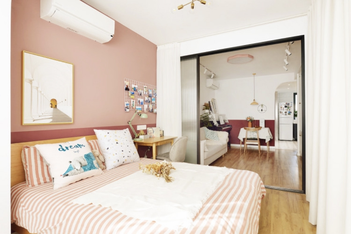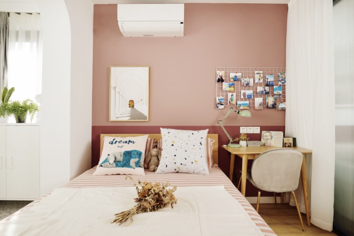臥室的另外一面墻也就是床頭墻面用的是拼色墻的設(shè)計(jì),下墻的顏色和客餐廳一致,上墻顏色是淺一點(diǎn)的藕粉色。