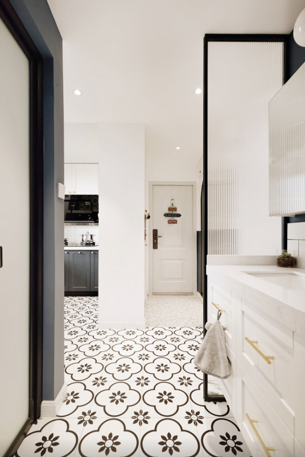 干區(qū)的長(zhǎng)虹玻璃隔斷(500*40*2400),即顯得通透同時(shí)也打破進(jìn)門一眼到底的視角,增加了一點(diǎn)私密性。隔斷并沒(méi)有順勢(shì)過(guò)寬,是為了不讓過(guò)道空間顯得過(guò)分急促,增加了公用面積。寬度正好和臺(tái)盆柜齊寬平。
