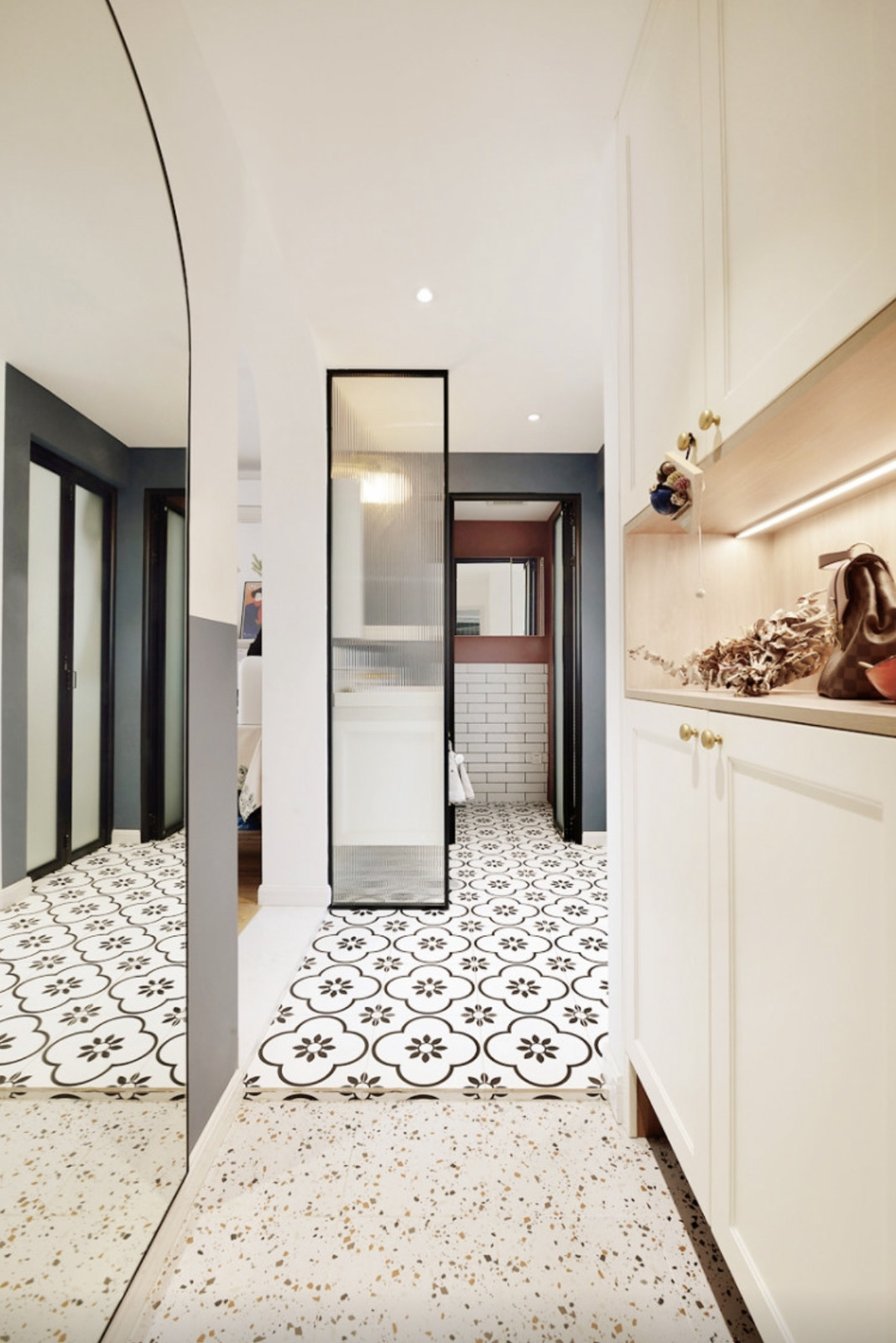 玄關(guān)地磚采用的是當(dāng)下流行的仿水磨石地磚。玄關(guān)的鋪磚落差設(shè)計(jì)特點(diǎn):區(qū)分了過(guò)道、廚房和玄關(guān)的空間,玄關(guān)落差區(qū)則是一個(gè)落塵區(qū)。