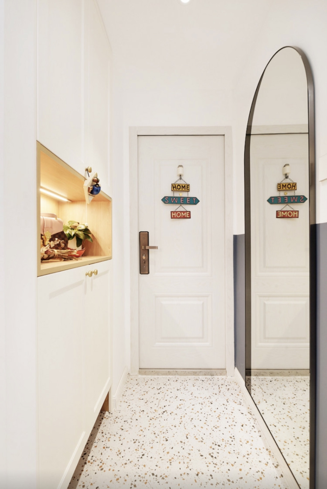 玄關(guān)區(qū)域的鞋柜頂天立地(960*350*2430)分割了玄關(guān)過(guò)道和廚房的空間,是整個(gè)空間動(dòng)線的起始點(diǎn),鞋柜做了上下柜,中間可以防止進(jìn)出門的手包鑰匙等物品。