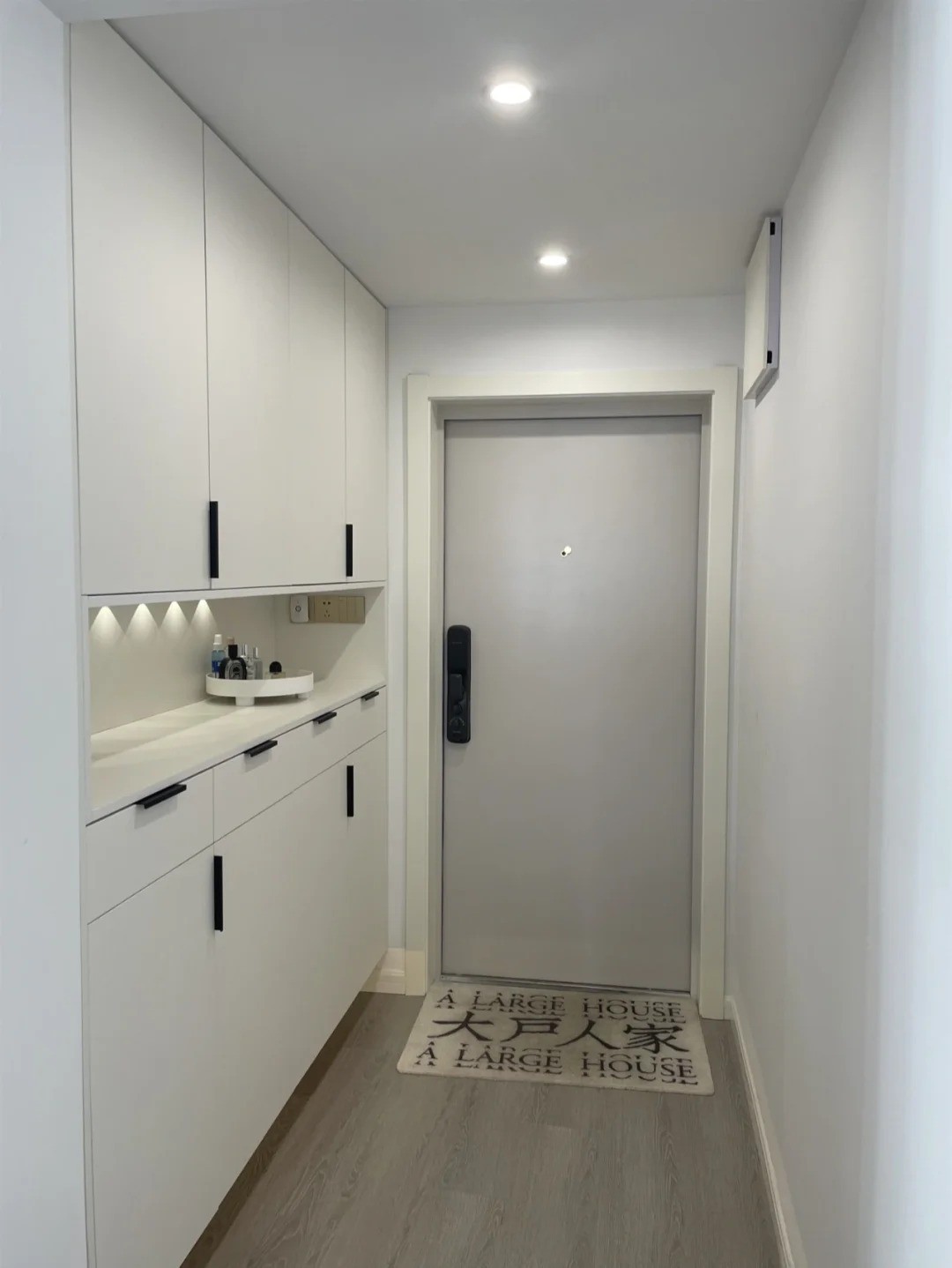 入戶玄關(guān)打造了一組鞋柜中間留空內(nèi)嵌燈帶,增加光線的同時又使空間更有層次感