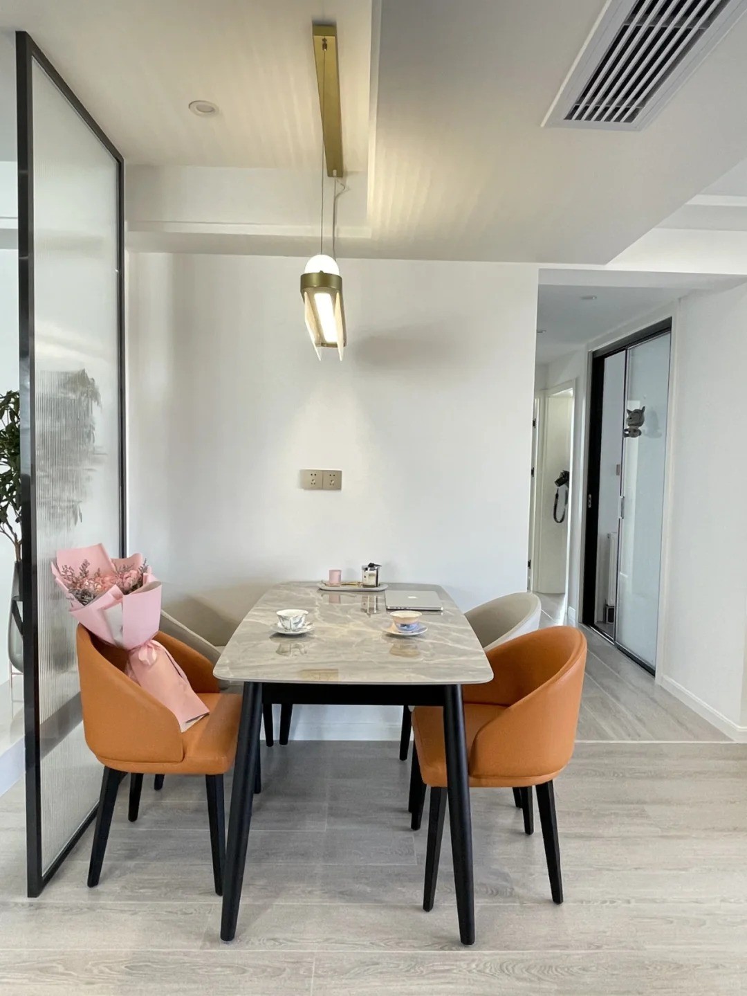 餐廳就藏在玄關(guān)后面,餐桌使用了巖板餐桌,很有質(zhì)感耐高溫,橙色的餐椅給餐廳增添了一抹亮色。設(shè)計了一個小型吧臺,業(yè)主有喝咖啡的習(xí)慣,平時也可以坐在這里喝喝咖啡。