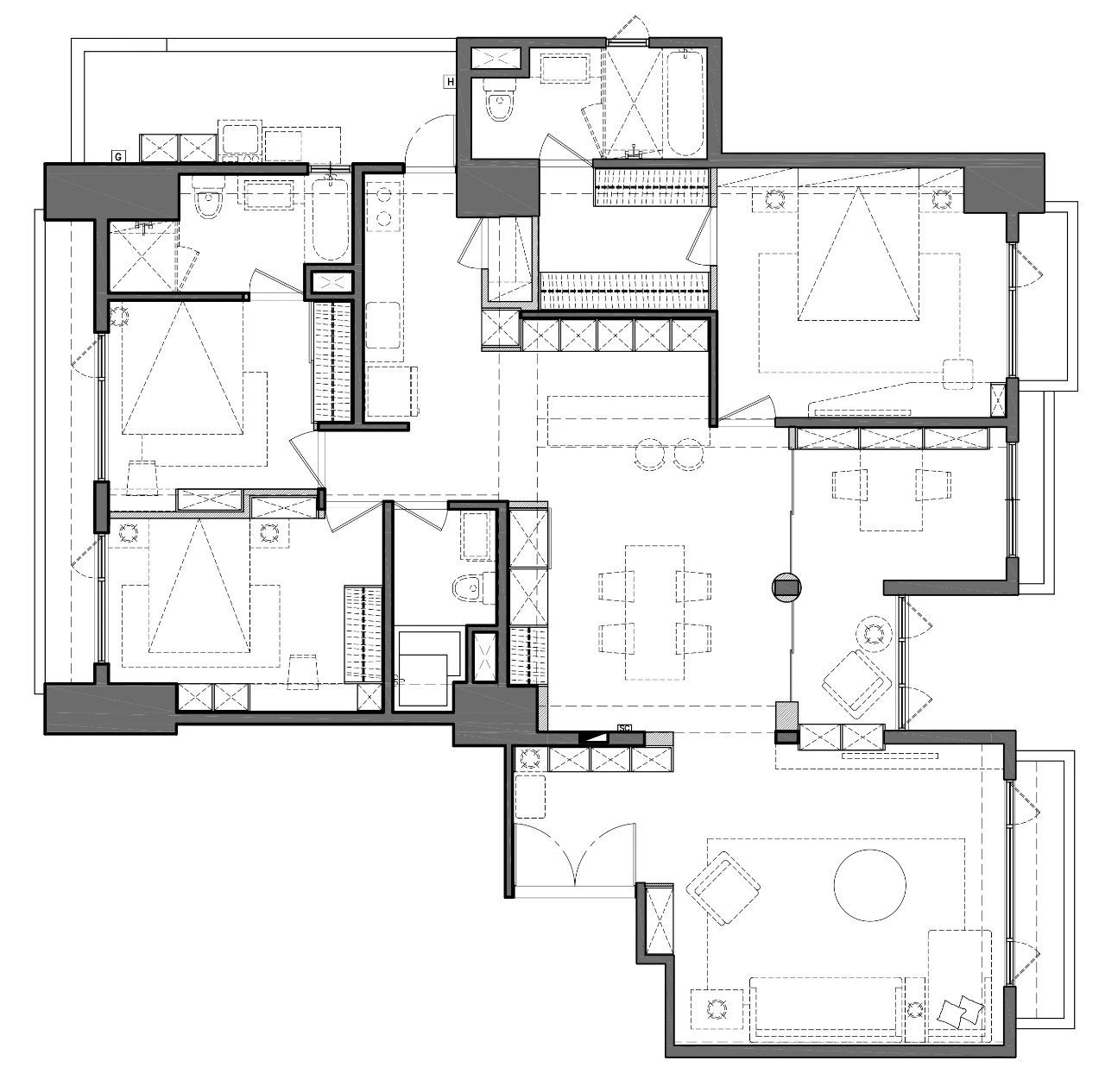 巧妙將鏡面、穿透性柜體等材質(zhì)技法虛實相生,在交錯之間衍生錯視平面,讓線條、框架、映像在轉(zhuǎn)換間既可以「層層推進」,也可以「移步換景」。通過拆解與重組、規(guī)則與變化、疏與密、實體與映像表現(xiàn)不同的虛實意蘊,化在有形與無形之間。將柱體包覆上鏡面消弭量體存在感及可能帶來的壓迫感,移植的映像讓景深無限放大。