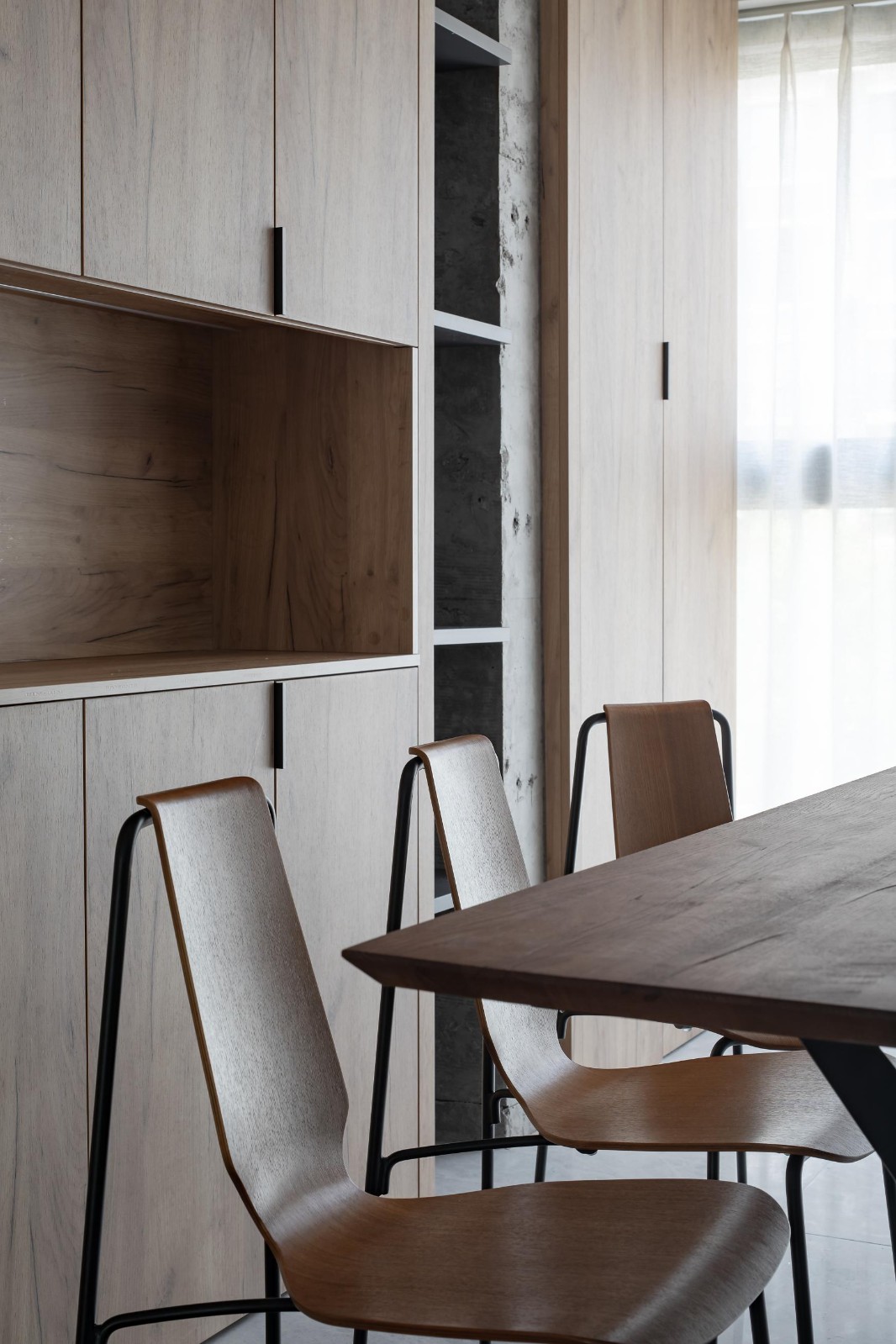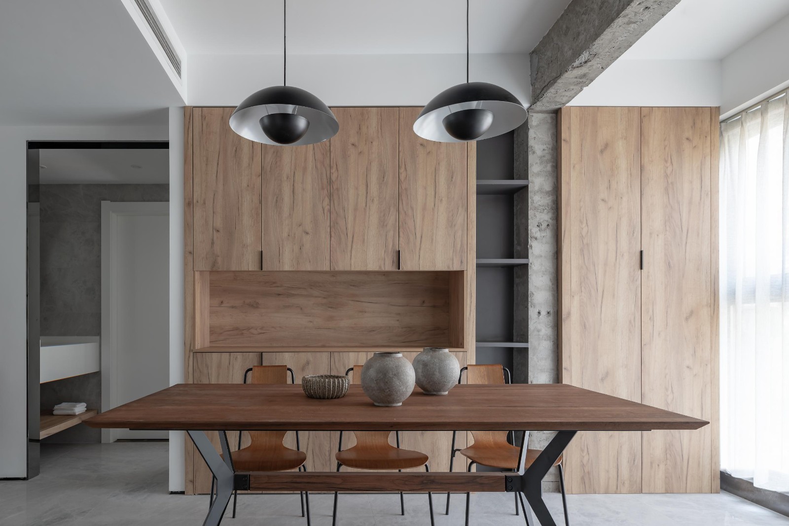 無論是家具結(jié)構(gòu),或是移門框架,還是吊燈材質(zhì),都遵循用統(tǒng)一,材質(zhì)是空間變得協(xié)調(diào)流暢的原則。