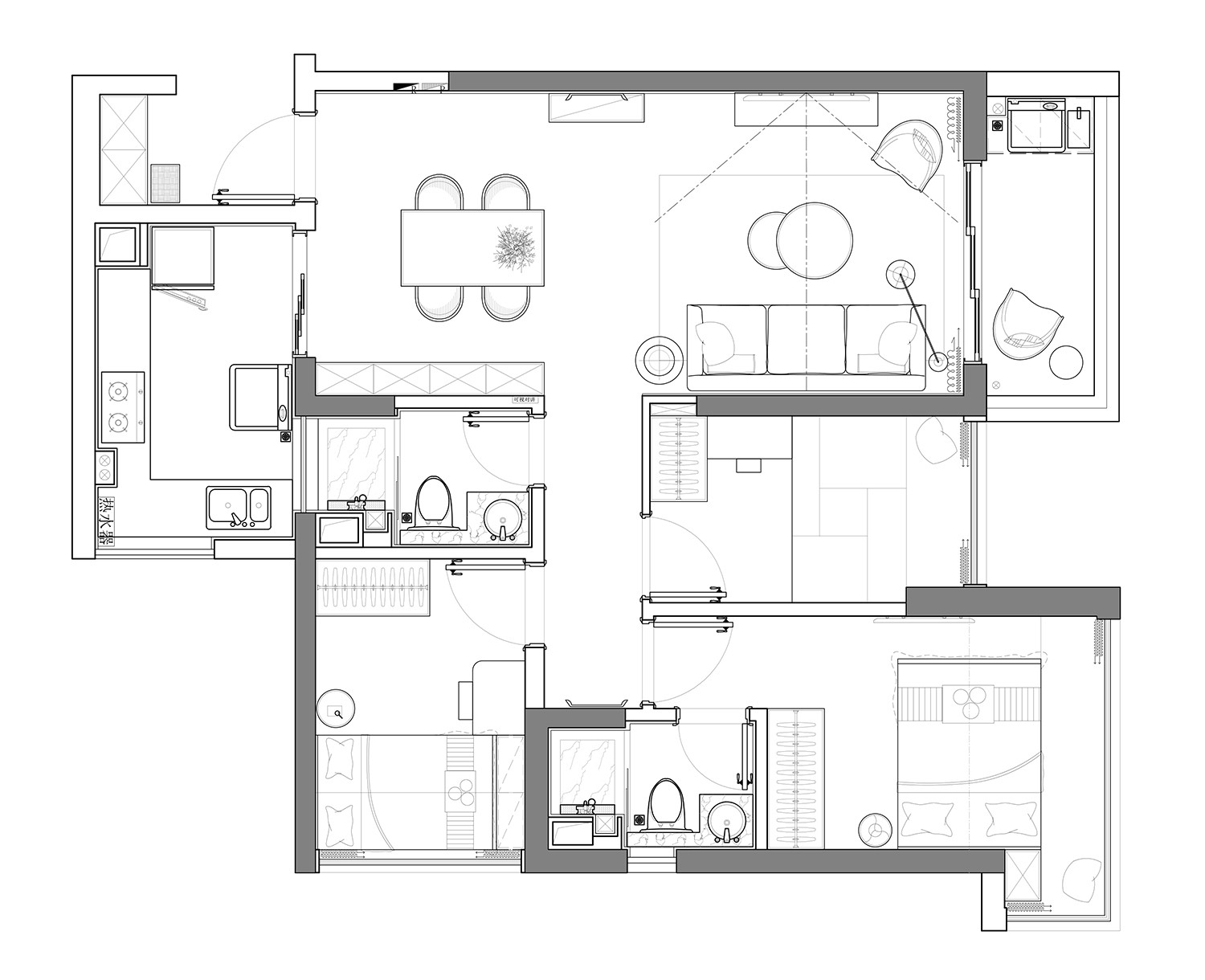 極簡風格通常使用直線、簡潔的線條和明確的幾何形狀,強調結構和形式的簡單性。這種線條的運用營造出整潔、現(xiàn)代的空間感。
