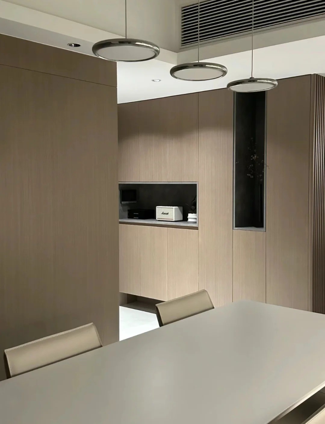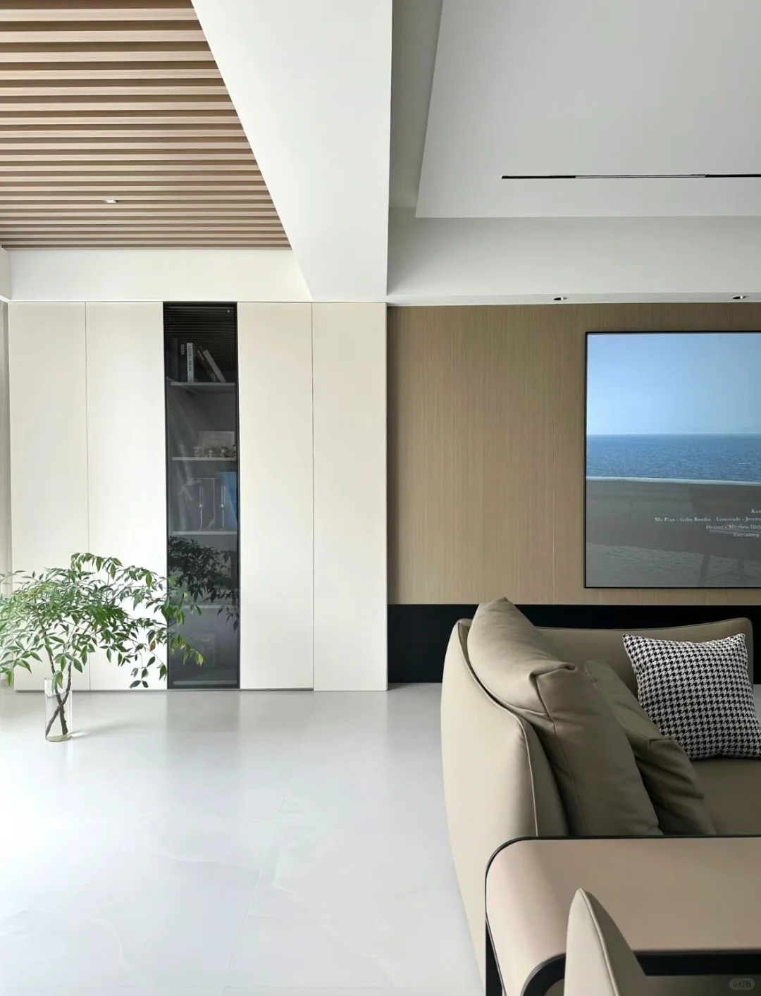客餐廳通鋪1800*900瓷磚,墻面是木飾面和藝術(shù)漆結(jié)合,既顯質(zhì)感又不會覺得壓抑。打通前陽臺、封窗設(shè)計,通透又顯大。