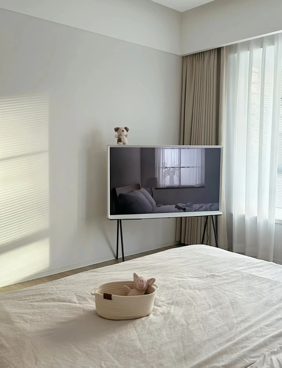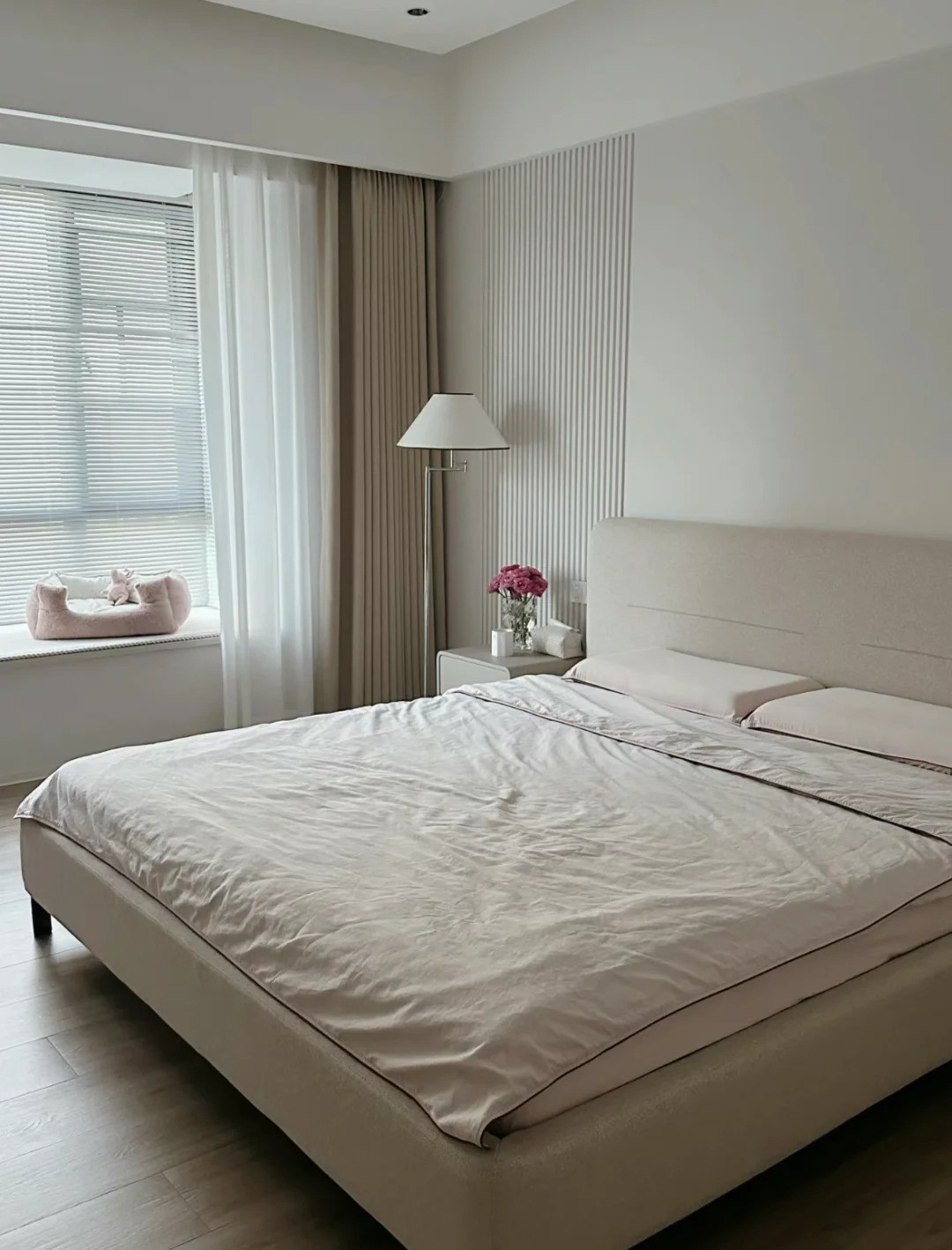臥室讓木工做了格柵造型背景墻,通刷乳膠漆。床尾整排嵌入式衣柜,搭配上米灰色床和奶茶色窗簾,舒適又溫柔~
