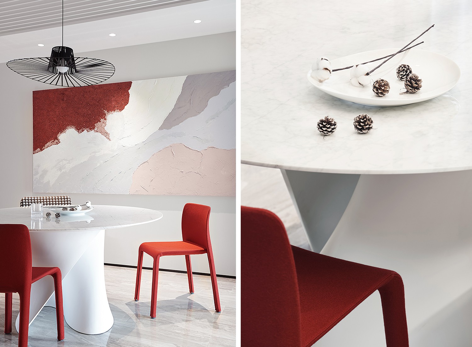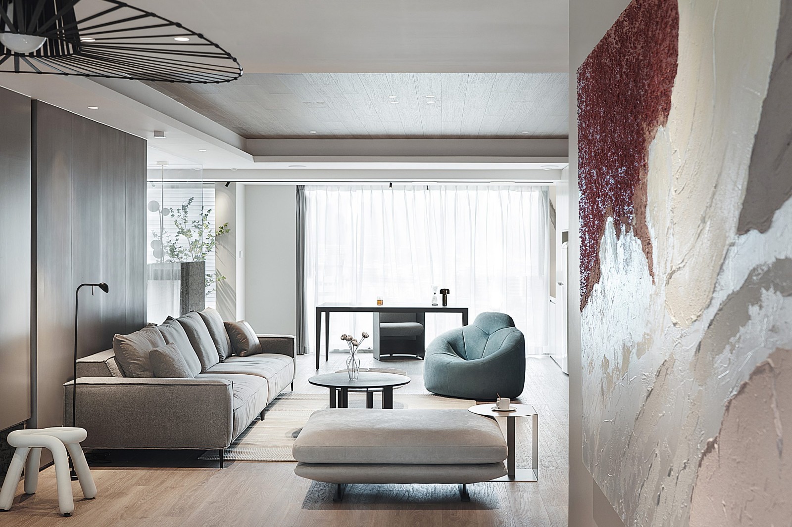 簡潔的基底上,設(shè)計通過線條、材質(zhì)的碰撞實現(xiàn)空間的豐富。沙發(fā)背景粗獷紋路的大理石與質(zhì)樸木飾面的碰撞,豐富了空間的肌理。