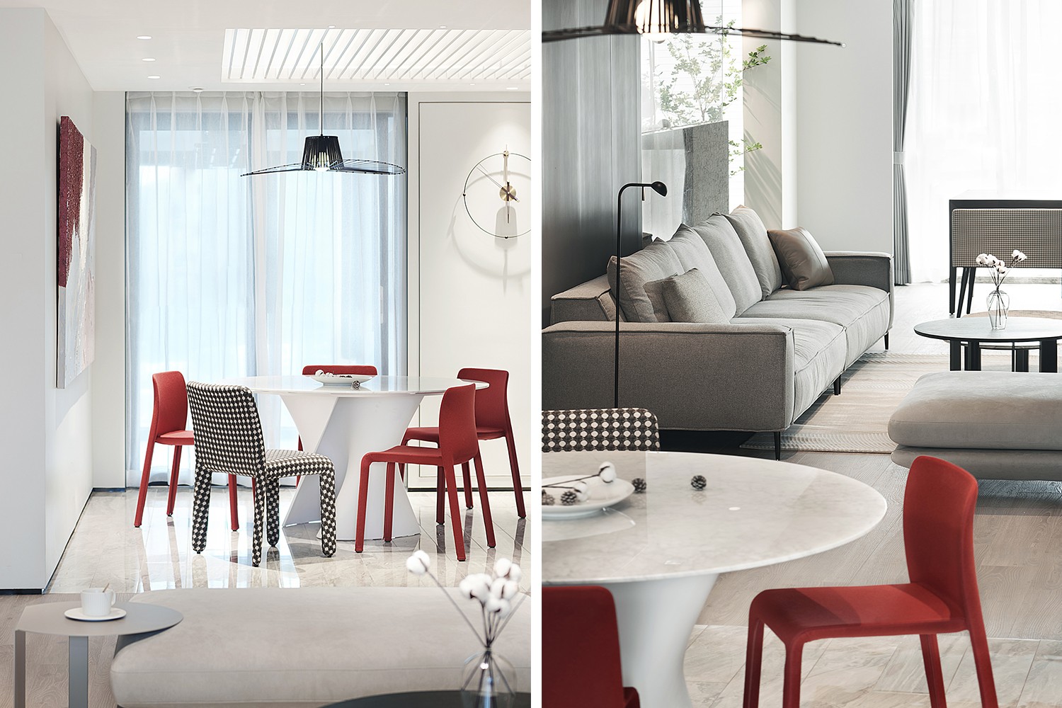 設(shè)計從”珍惜眼前人”出發(fā),以木棉的花語點(diǎn)題。在環(huán)保與功用的前提上,設(shè)計師遵從減法策略,舍棄了生活必需品外的所有裝飾物,并將各種體塊通過切割、穿插、貫通等建筑手法,重新組合成一個擁有豐富功能的純凈空間。