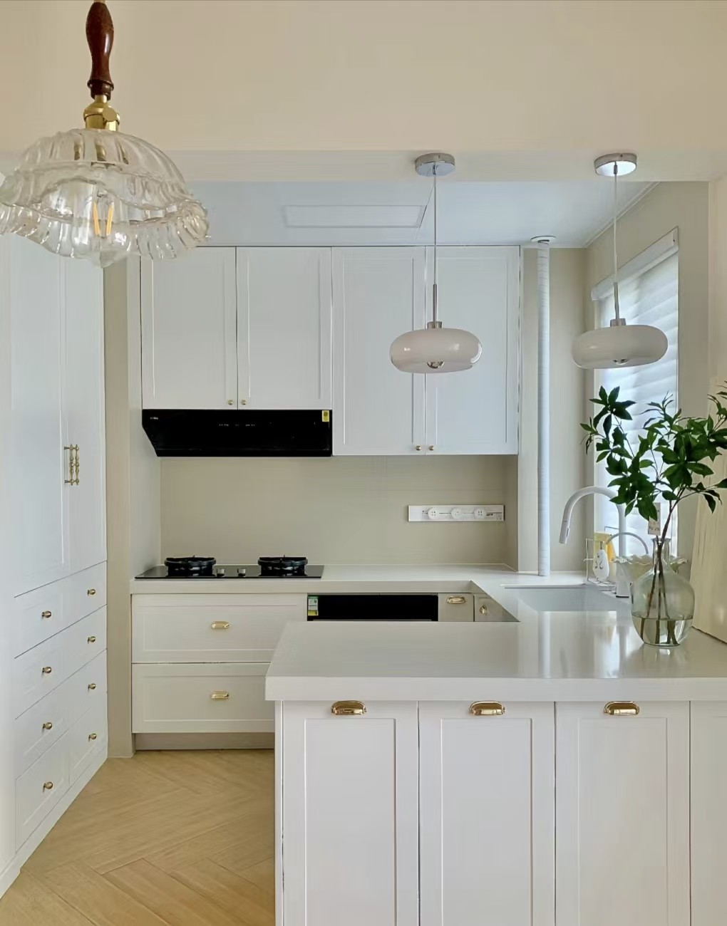 廚房半開放式,白色櫥柜,設(shè)計(jì)儲(chǔ)物空間很足