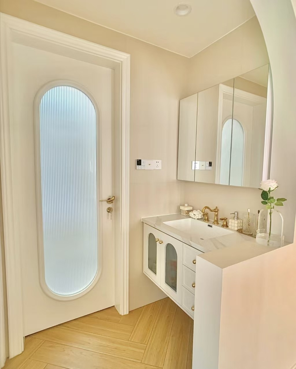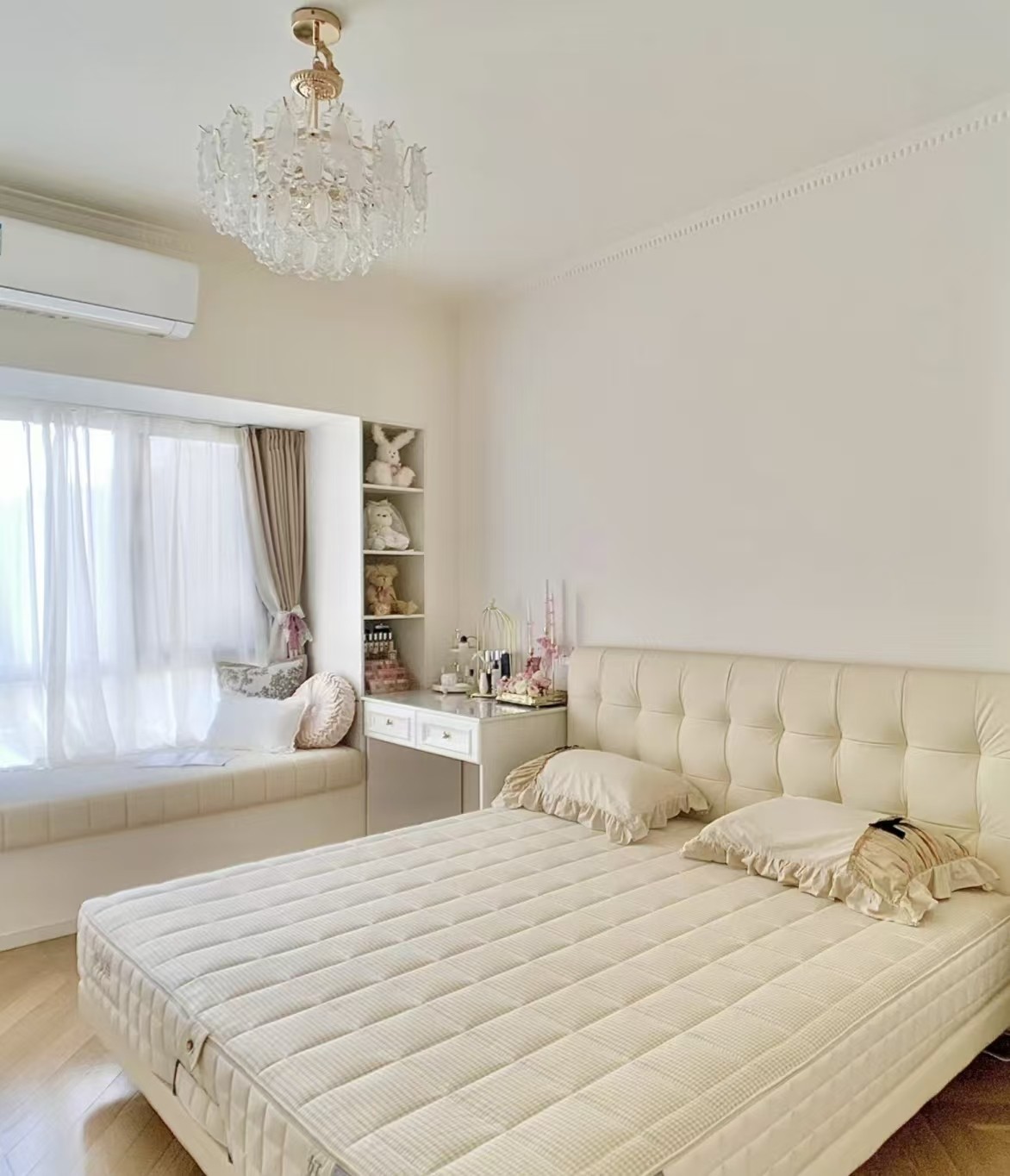 臥室墻頂可可蛋奶,魚骨拼木地板,做了飄窗