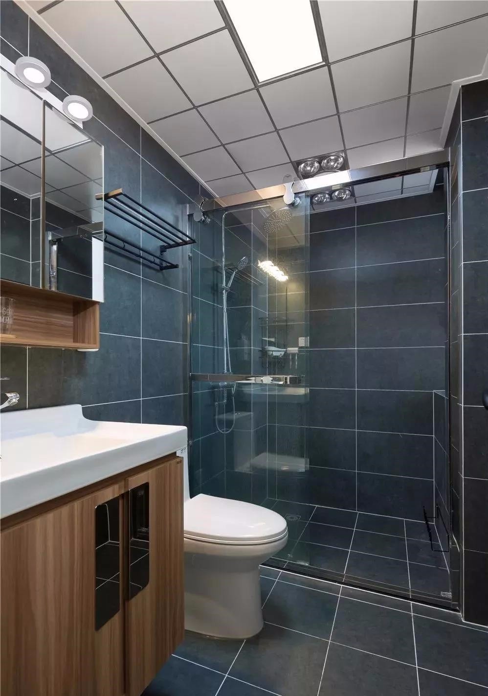 衛(wèi)生間,墻壁,地面是統(tǒng)一深色系瓷磚,耐臟衛(wèi)生間干濕分離,大方,實用。