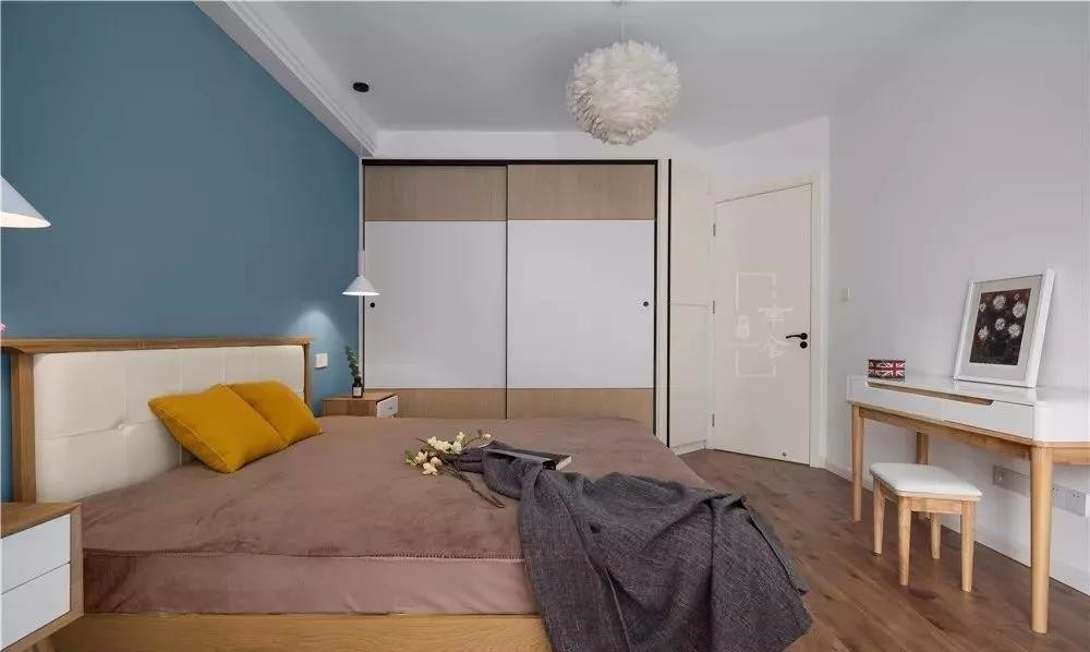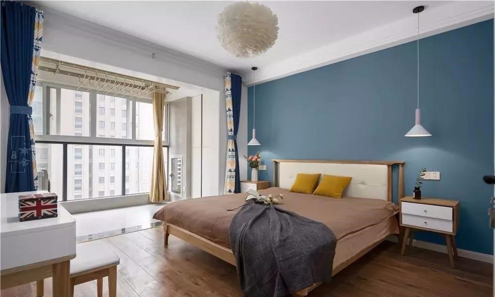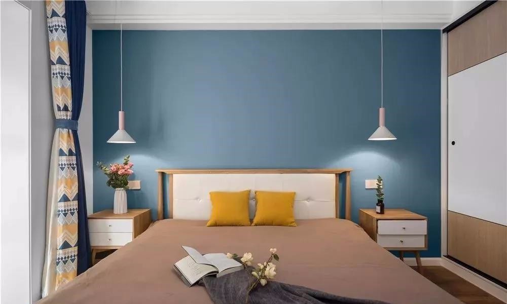 臥室背景墻,藍(lán)色墻漆,清爽,靜謐。兩邊懸掛的吊燈,及床頭柜,對稱美,原木色在燈光下更溫馨舒適。