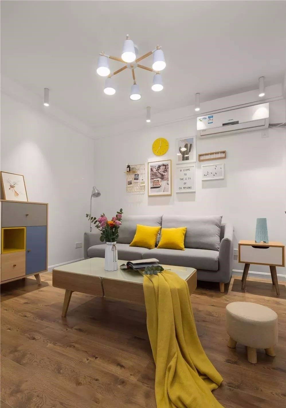客廳空間不大,但是設(shè)計十分精巧,灰色布藝沙發(fā)、茶幾、邊幾等,都足以滿足日常需求,簡單、大方。