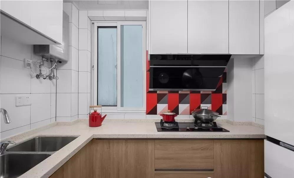 廚房空間雖然不大,里面是L型設(shè)計,色彩搭配淺色為主,干凈、明朗。