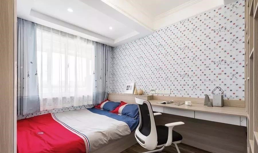兒童房墻壁鋪了壁紙,簡(jiǎn)單、漂亮。為了實(shí)用設(shè)計(jì)榻榻米,一端連衣柜,書桌懸空與床頭基本持平,整齊,大方。