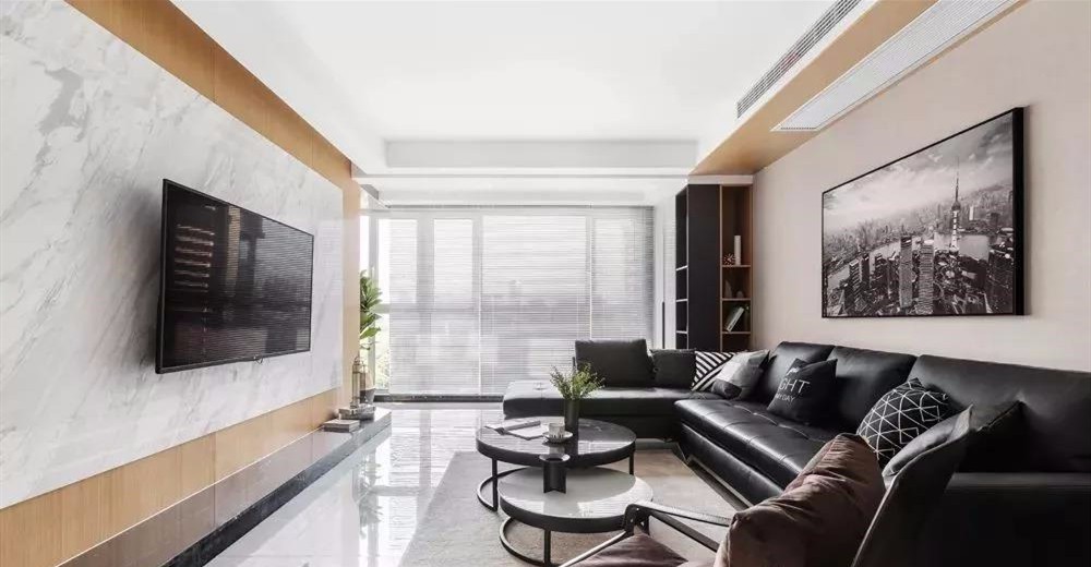 客廳一整面大大落地窗,為空間提供充足光線百葉窗簾,簡(jiǎn)約、漂亮,黑色皮質(zhì)L型沙發(fā),更符合現(xiàn)代風(fēng)。