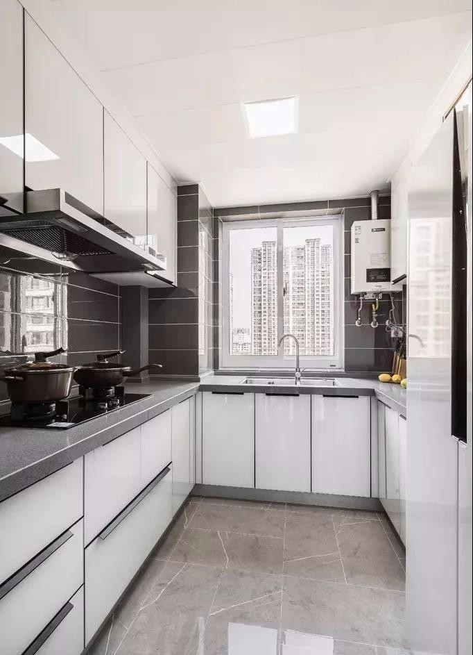 廚房色系耐臟,材質(zhì)便于清潔,墻壁與地面瓷磚,以深色系為主
