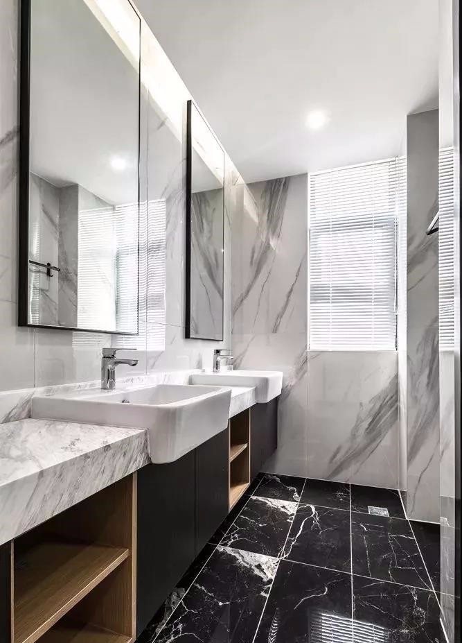 衛(wèi)生間空間比較大,設(shè)有雙人洗手臺(tái),方便家人日常洗漱。臺(tái)面下方,設(shè)有收納地方,實(shí)用,且上檔次。