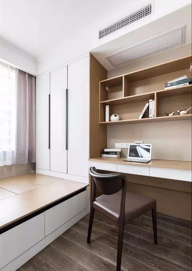 次臥空間較小,也是榻榻米設(shè)計(jì),盡可能省空間,滿足日常需求,旁邊設(shè)有書桌、書架,可以辦公、學(xué)習(xí)。