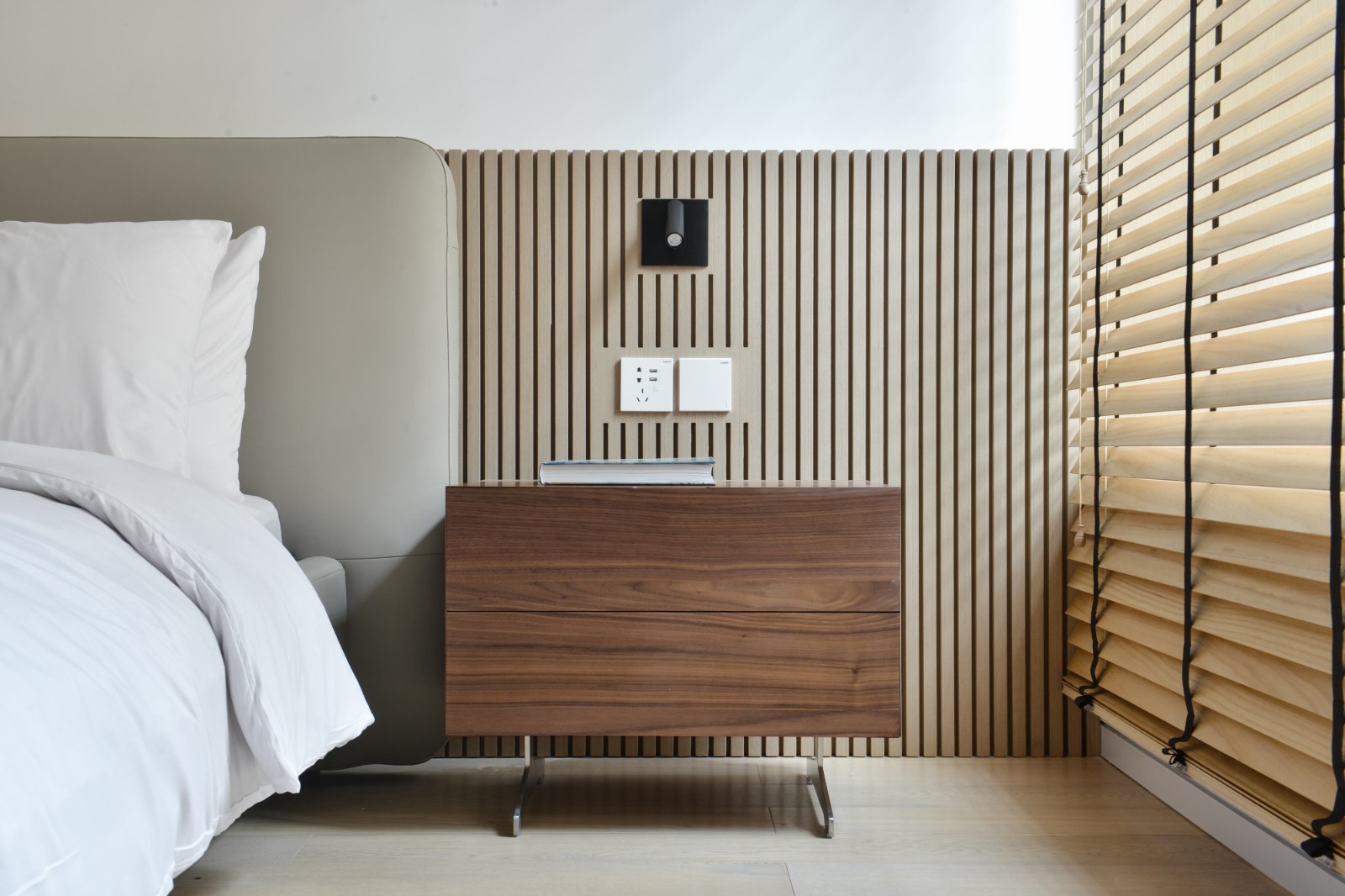 搭配了木格柵的窗簾,與床背景呼應(yīng)
