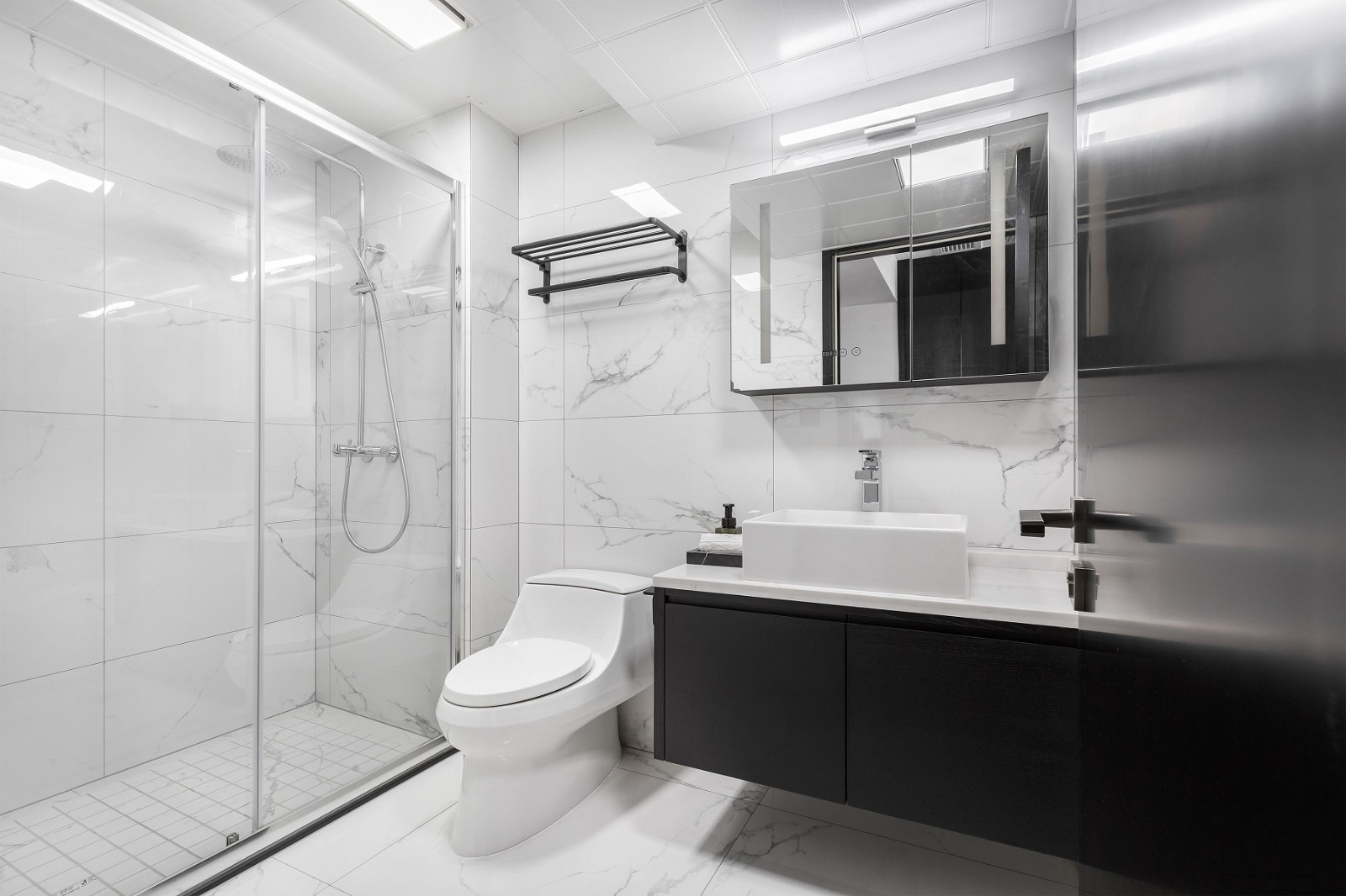 墻面帶紋理的大面積瓷磚搭配黑色的衛(wèi)浴柜