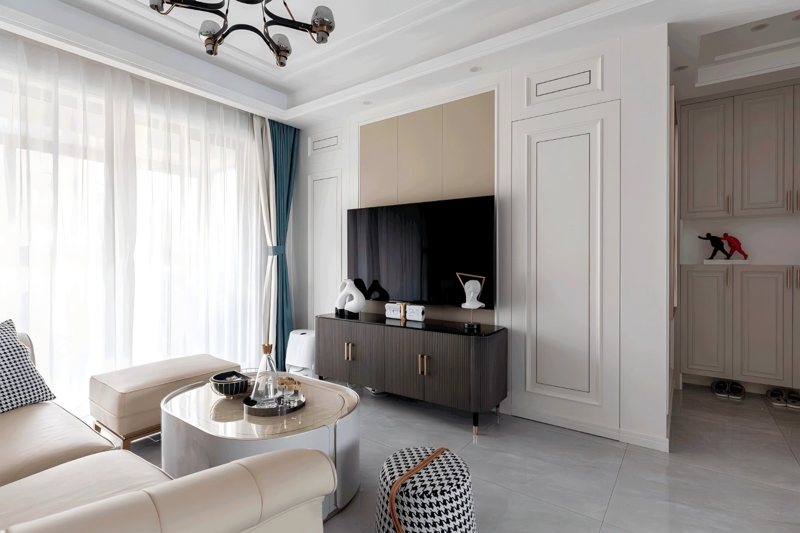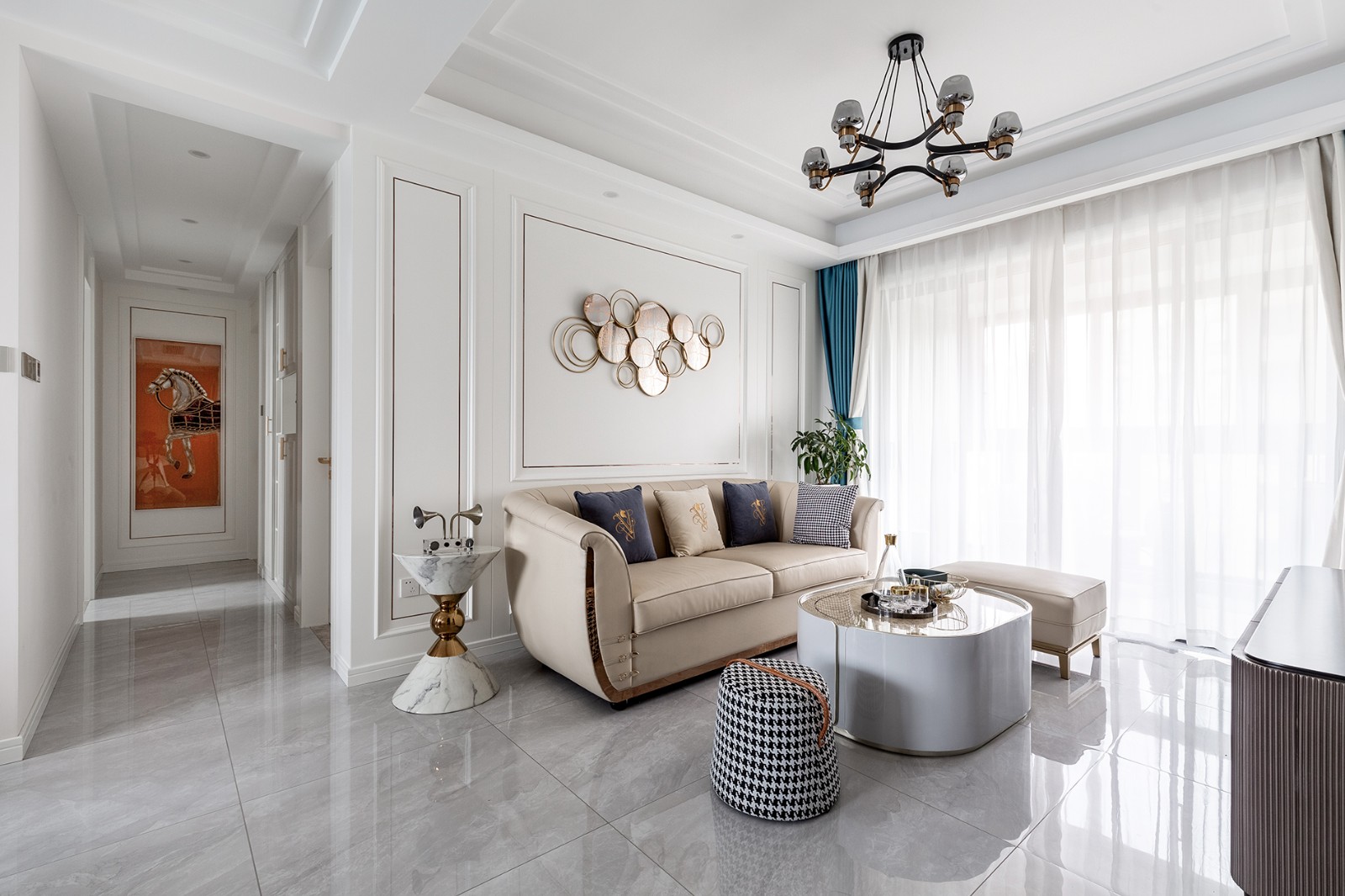 標題:簡歐輕奢 項目名稱 | 龍湖天璞 項目面積 | 127㎡ 三室兩廳兩衛(wèi) 高層 設(shè)計風格?| 簡歐 裝修類型 |?全包裝修 全包造價 |?25萬 案例說明:輕奢風格,本屋女主是以為潮流博主,也是以為忙碌的電商人,整個裝修過程只到過現(xiàn)場四次,心領(lǐng)神會 將女主的喜好最終柔和到了整個設(shè)計中:將客房門移到電視墻做隱形門,將空調(diào)還給玄關(guān),又不會影響電視機整體視覺效果,并且讓客房得到一個完成的小衣帽間