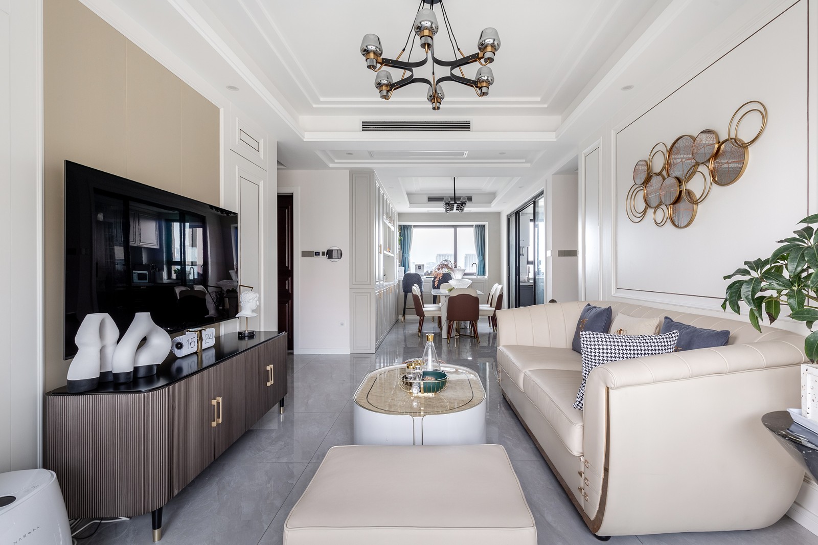 客餐廳:客廳的吊頂與吊燈與餐廳呼應(yīng),沙發(fā)與電視背景墻 隱藏門采用護墻板做裝飾,米色西真皮沙發(fā) 質(zhì)感細膩溫潤,盡享舒適體驗