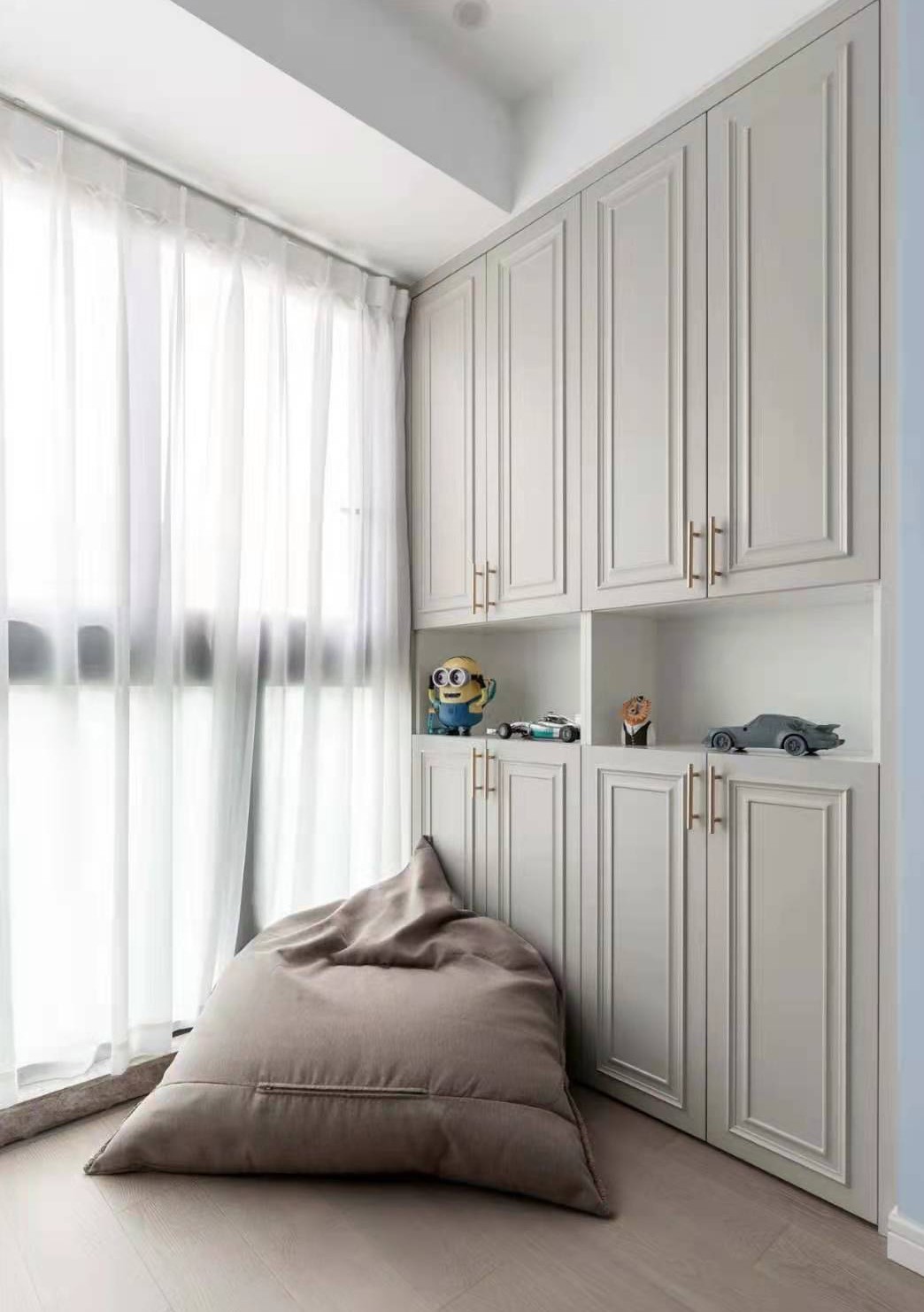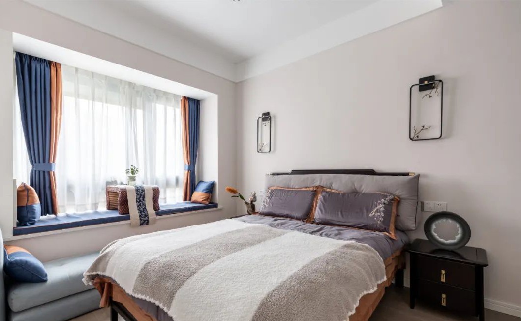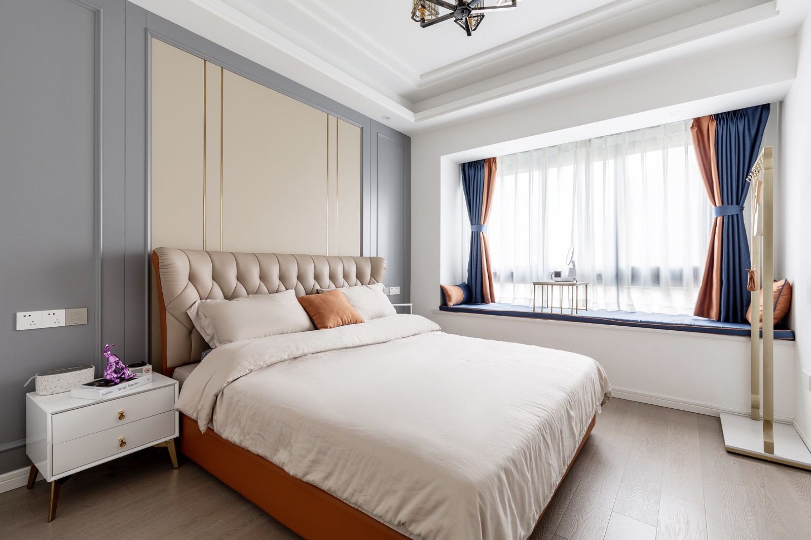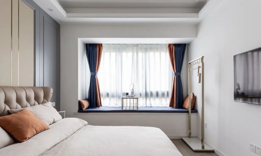 臥室:主臥整體是溫馨靜雅的簡歐風格,設(shè)計元素與其他空間都有呼應(yīng):床頭背景墻米黃的硬包,兩側(cè)深灰的護墻板, 配上窗簾和靠枕的跳色,豐富視覺效果,讓主臥有了自己的韻味。
