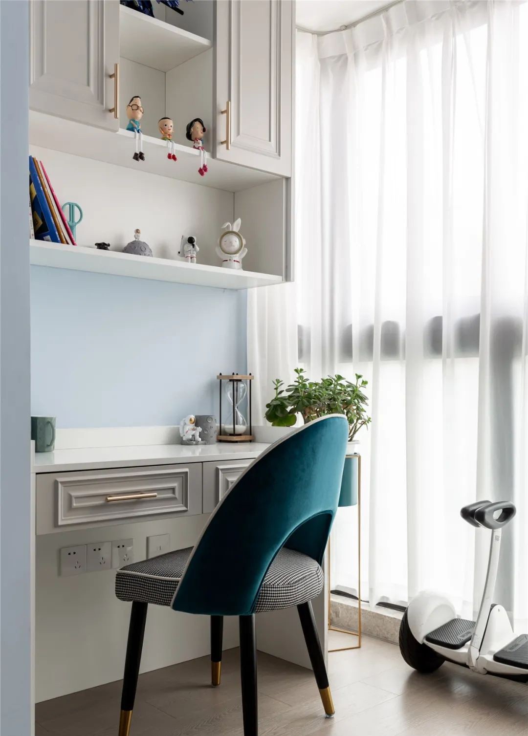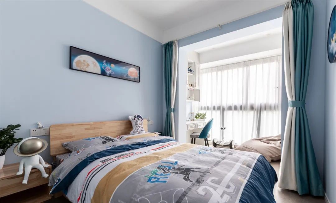 次臥:延續(xù)溫馨簡約底色,搭配活潑跳色的掛畫,電競桌椅,增添了空間的趣味性