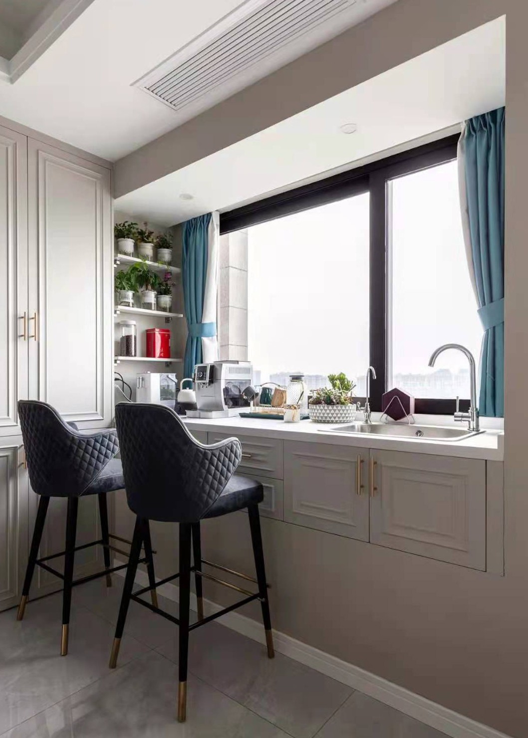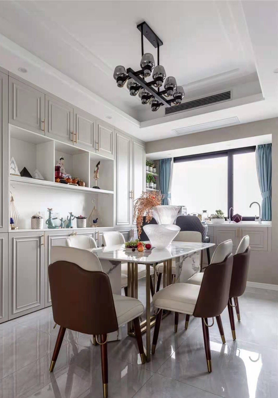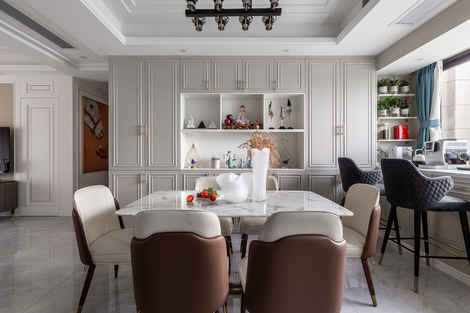 餐廳:接近4米的餐邊柜極大滿足了屋主的收納需求,飄窗不能敲,改成了水吧臺,增加了兩層抽屜,做成中西廚的分隔設(shè)計,操作方便