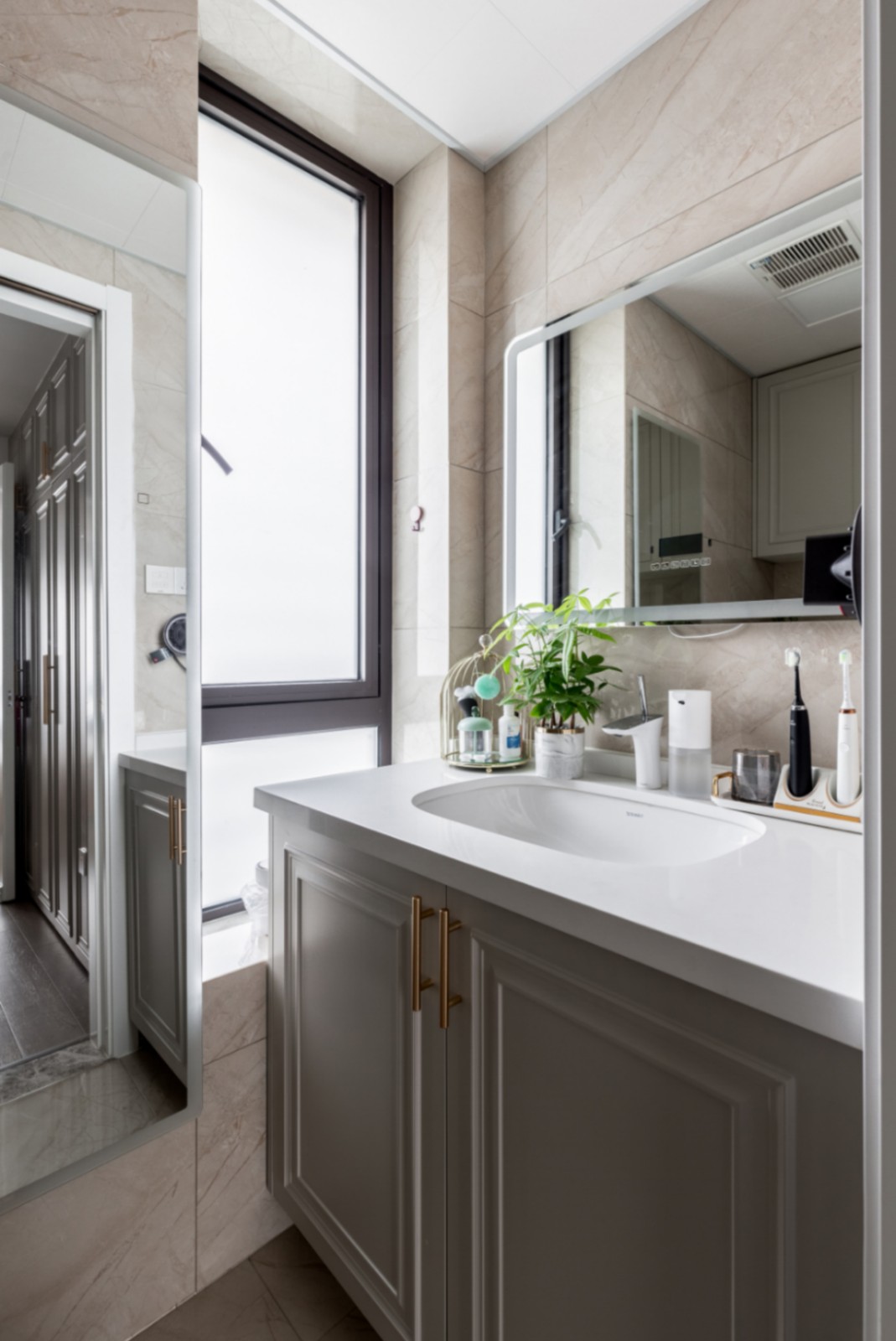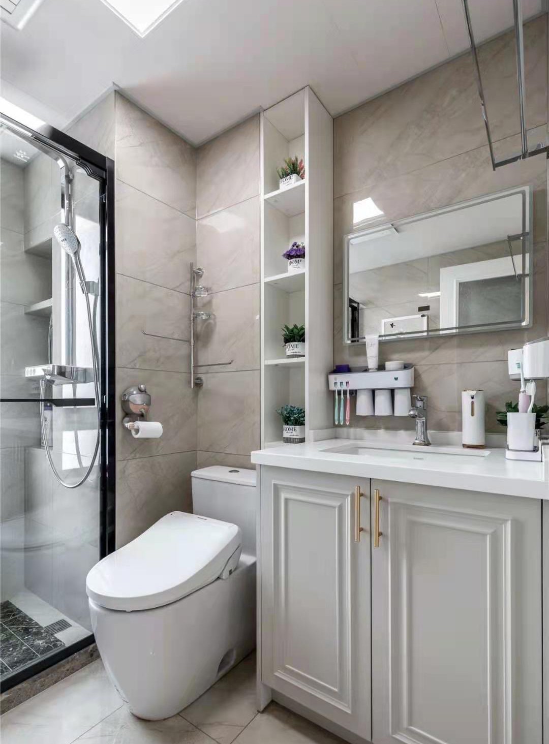 衛(wèi)生間:米白墻地磚通鋪,沉穩(wěn)大氣。置物閣擺上綠植,只為心情愉悅。 淋浴房大理石上墻,略顯浮夸, 但在自己家,需要些不羈。