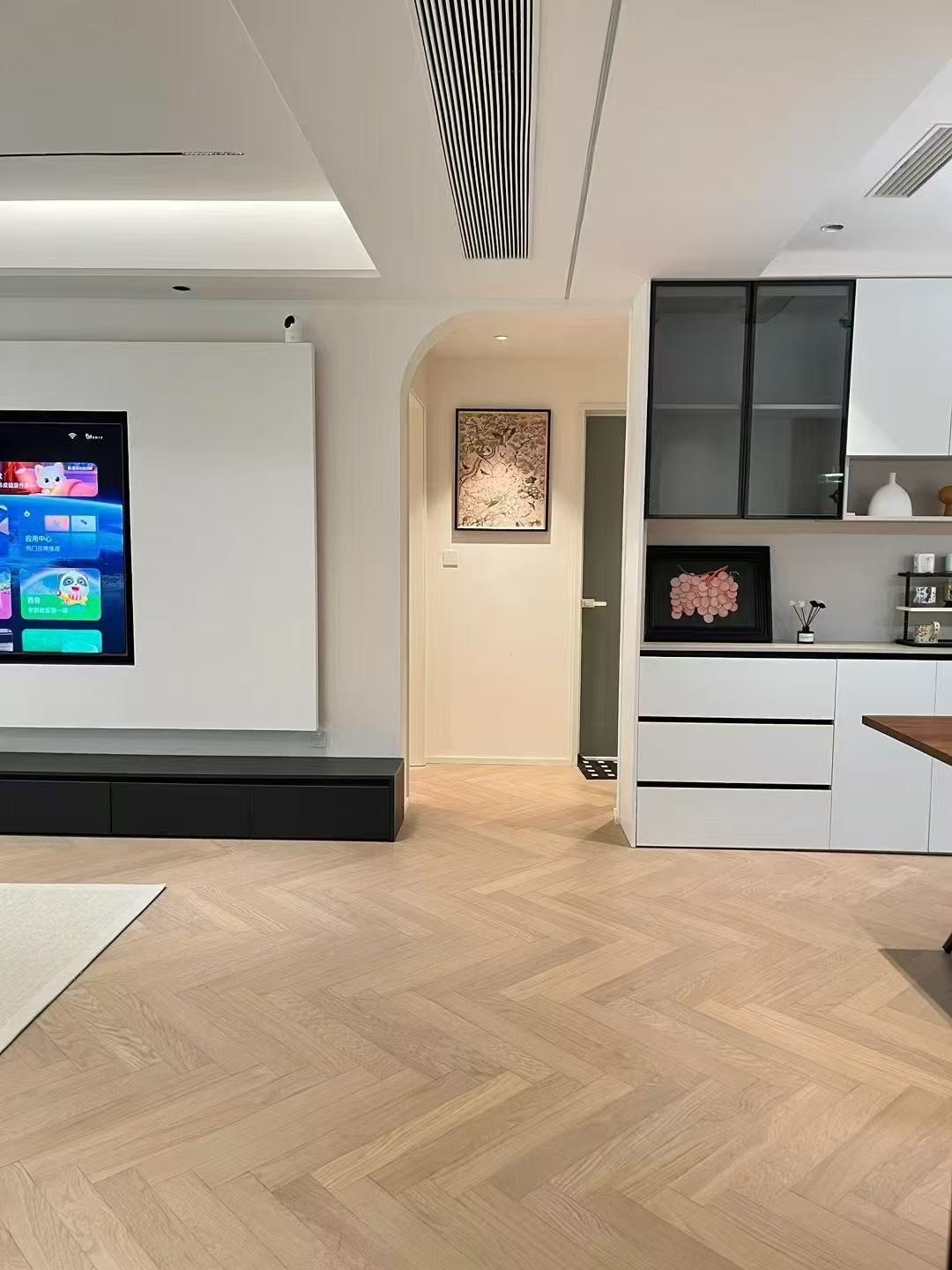 客廳過道采用人字鋪地板 原木奶油風的色系 溫馨美感