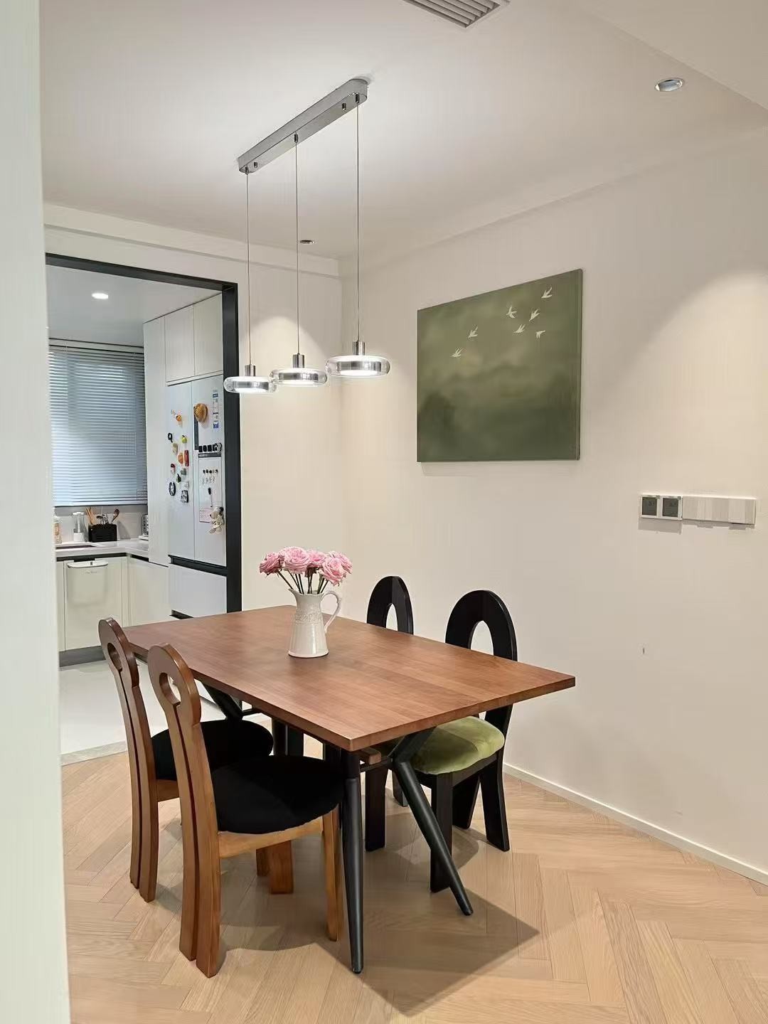 原木色餐桌配上淺綠色掛畫法式奶油又加點復古感