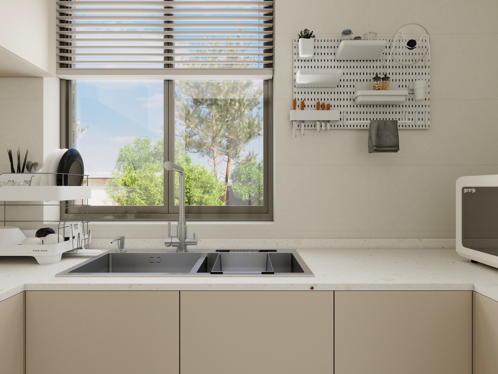 廚房雖然縮小空間 但是做了U型臺(tái)面 增加廚房櫥柜使用長度,門從中間開