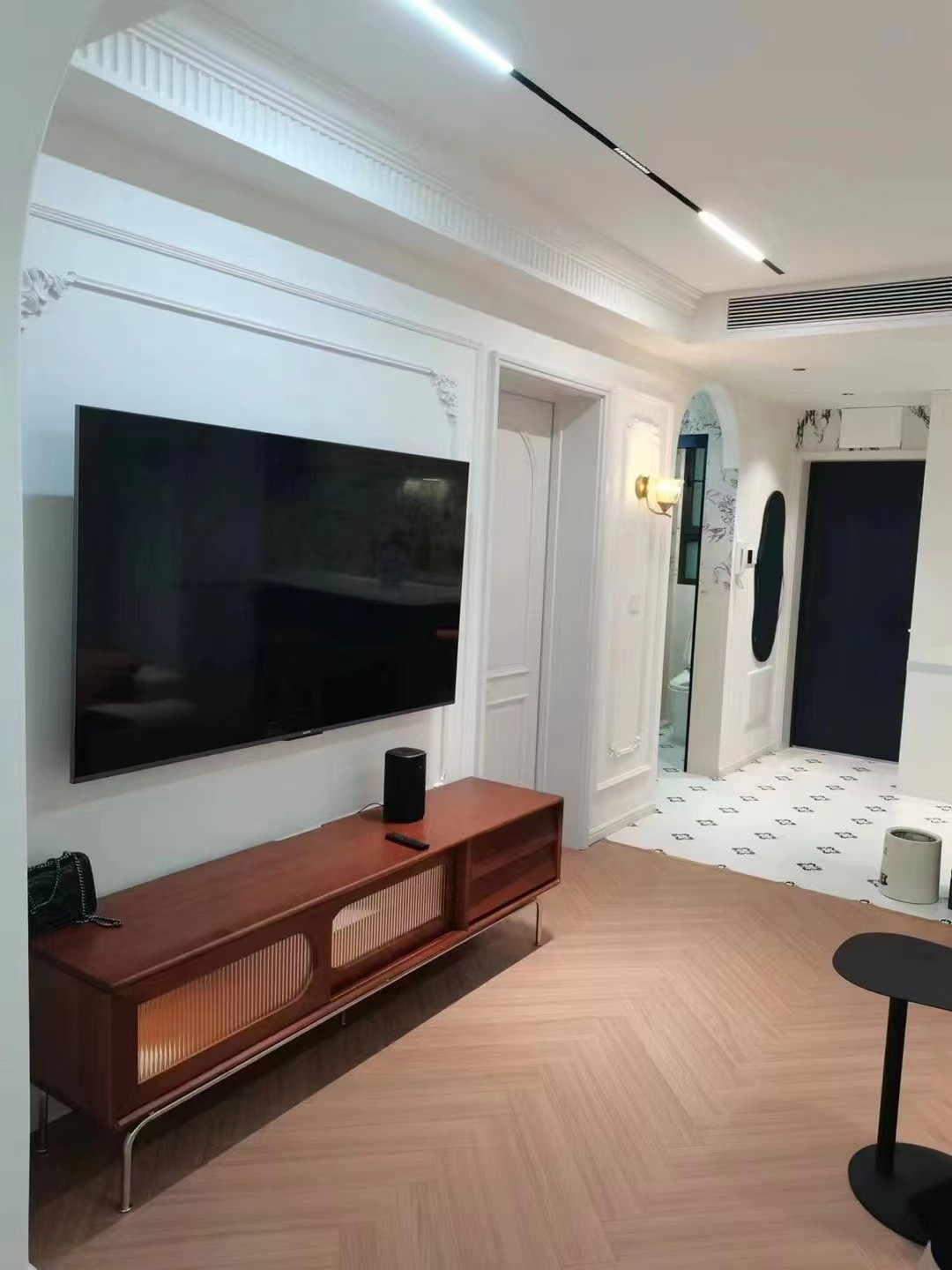 客廳用的是棕色的人字拼地板,搭配以深棕色電視柜,帶有一絲中式復(fù)古的味道