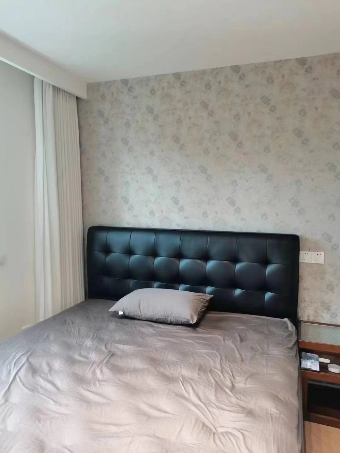 臥室的床采用的黑色皮質(zhì),配以臥室的背景墻,美觀又好看