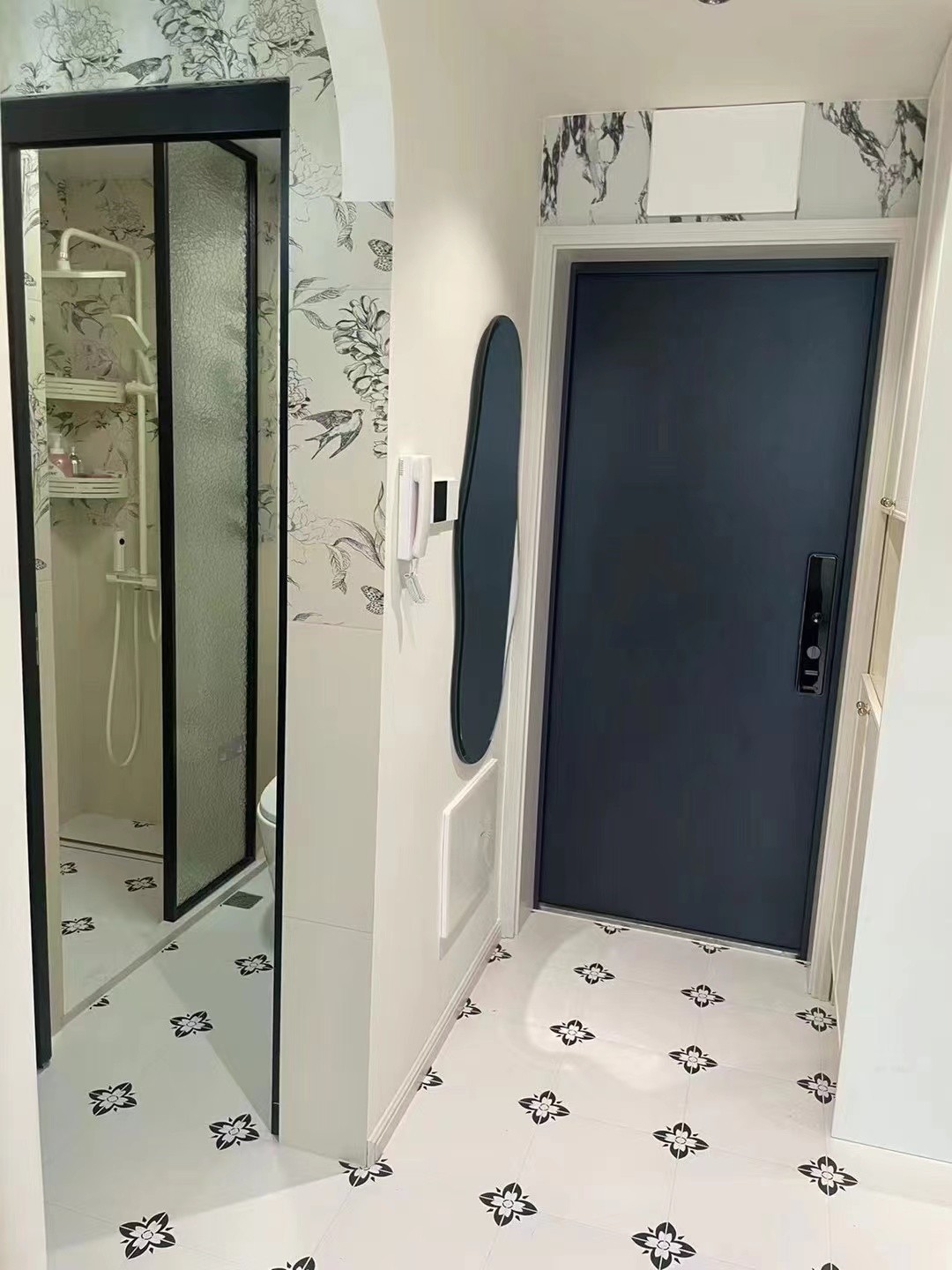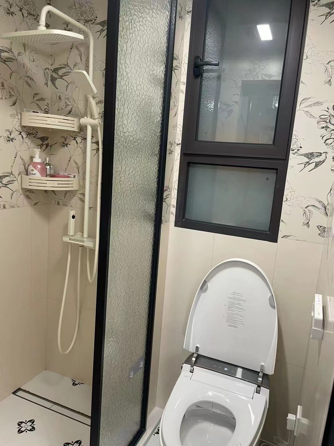 衛(wèi)生間采用了花磚,上面是喜鵲的花磚,下面是非常簡單的奶油色磚,整體感非常精致美觀