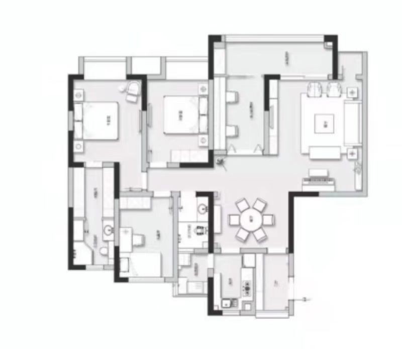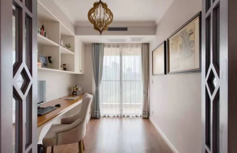 書房做成靠墻的雙人書桌,方便夫妻二人一起工作,游戲。其余空間,作為女業(yè)主的瑜伽健身區(qū)。書房門采用4扇折疊門,還是為了保持空間的通透性與連貫性