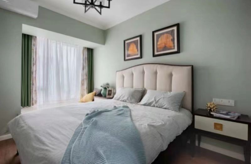 主臥墻漆選用的是抹茶綠,選用帶有黑色線條的窗體及帶黑色線框的掛畫,和諧一致