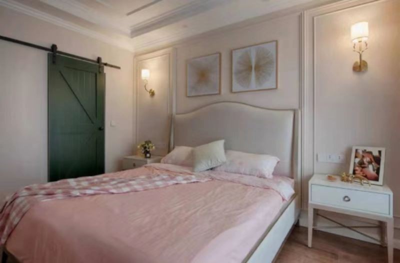 次臥做的谷倉門,床選用的色系也和涂料顏色相統(tǒng)一