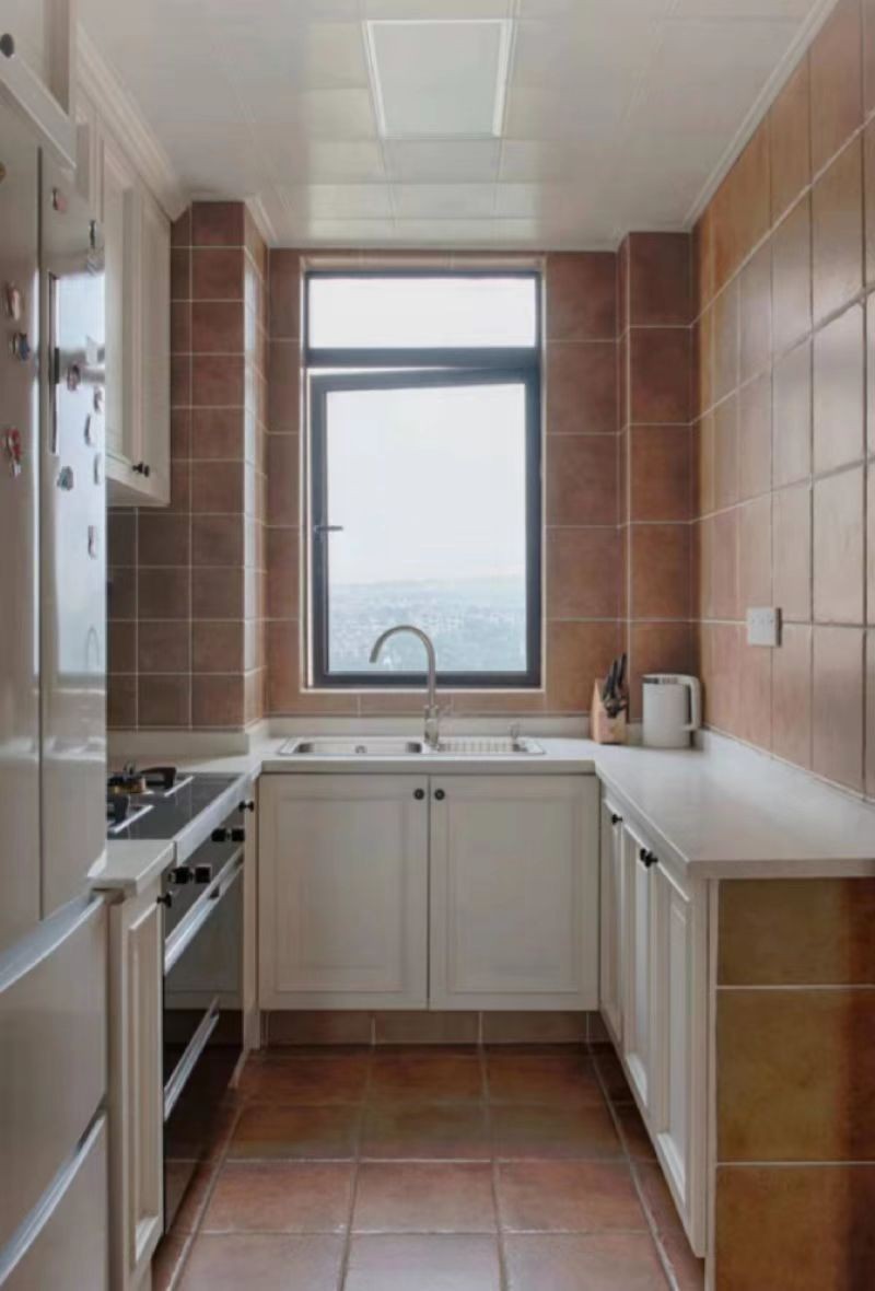 廚房用的是棕色的墻地磚,搭配白色的櫥柜,非常有感覺