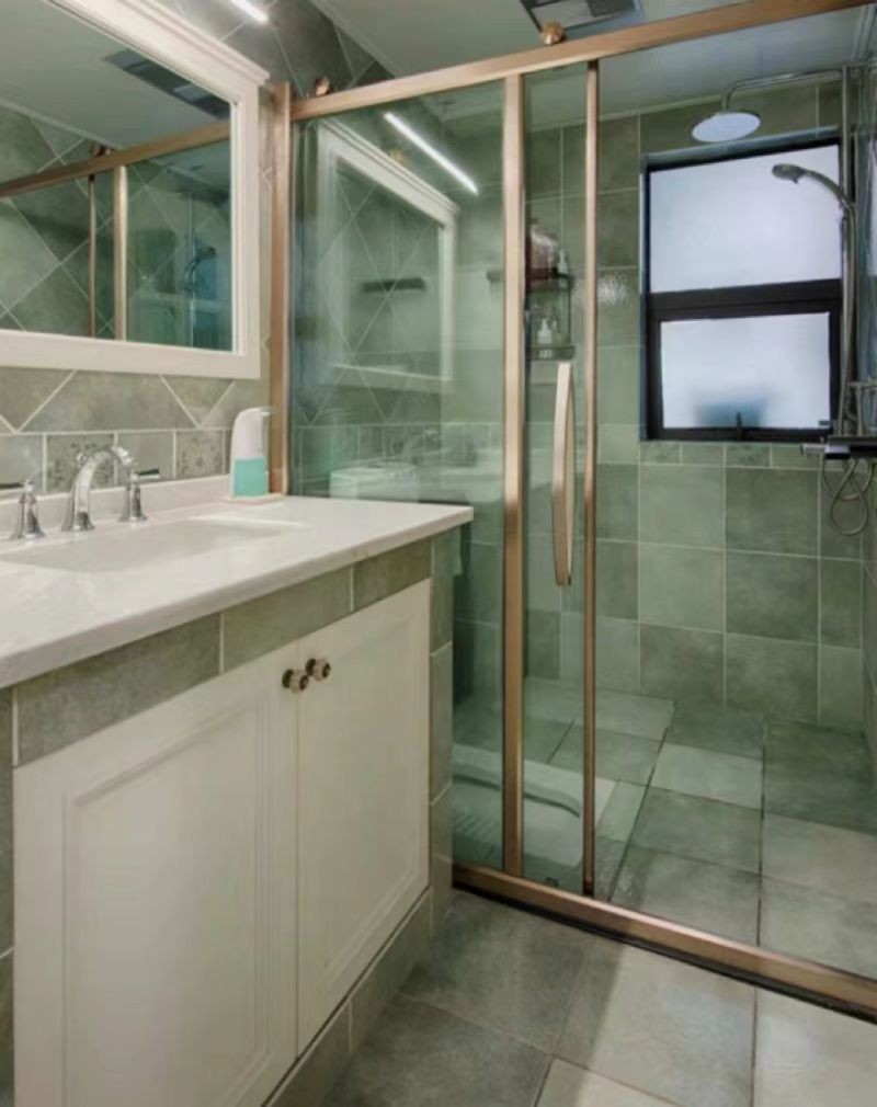 衛(wèi)生間選用的是綠色的墻磚,搭配淺灰色地址