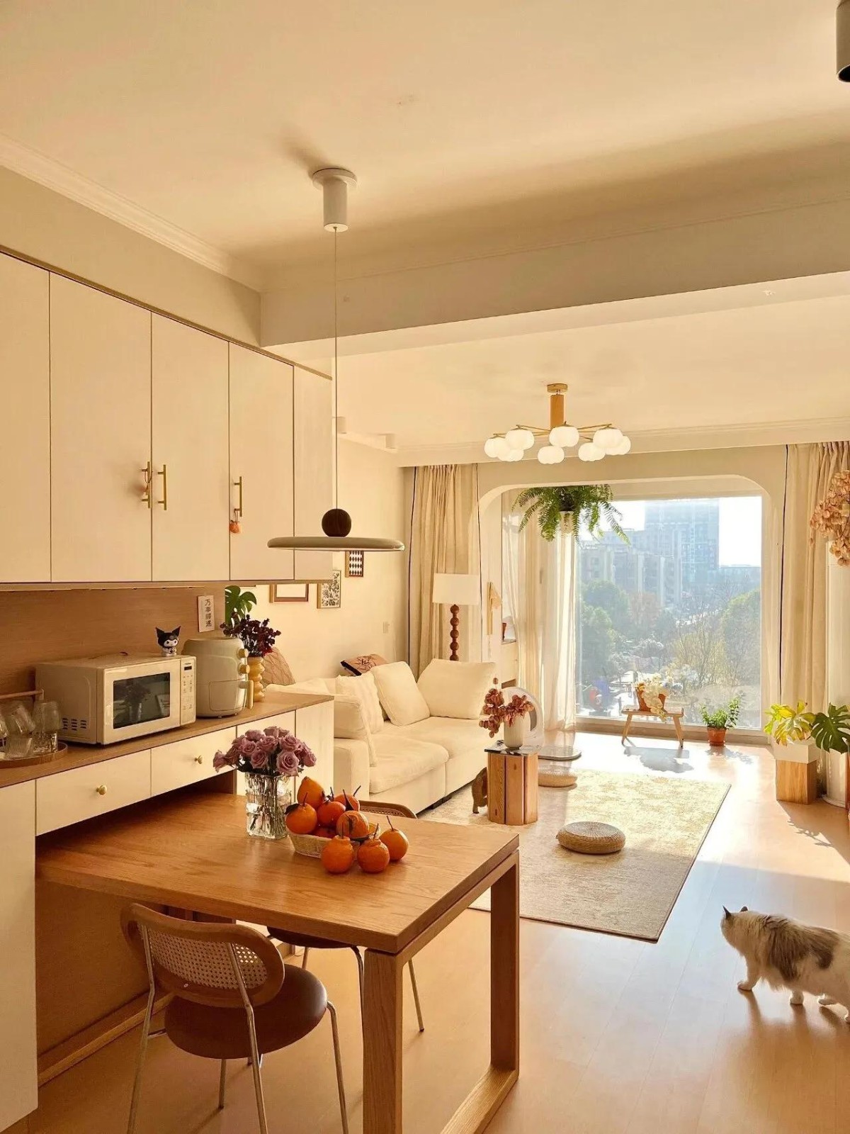 墻面是柔和的奶咖色乳膠漆,地面鋪淺橡木色實(shí)木復(fù)合地板,搭配米白色 L 型布藝沙發(fā),淺木色茶幾邊緣帶點(diǎn)圓潤(rùn)弧度,每一處都在弱化 “硬質(zhì)” 感,把原木的溫潤(rùn)和奶油的柔和揉成了一團(tuán)松弛感。