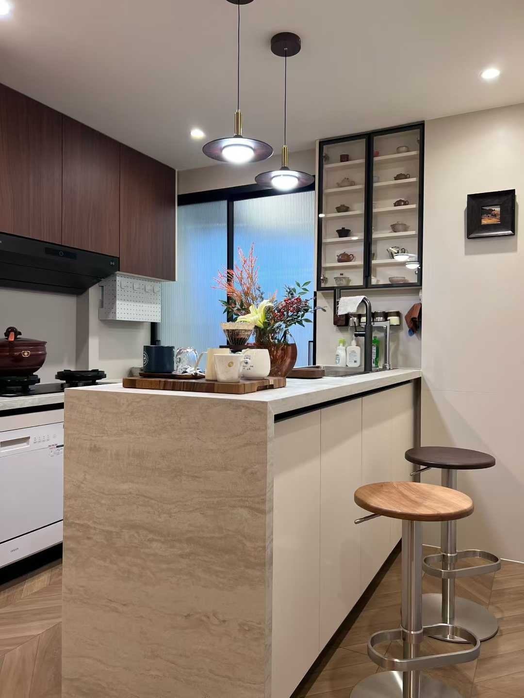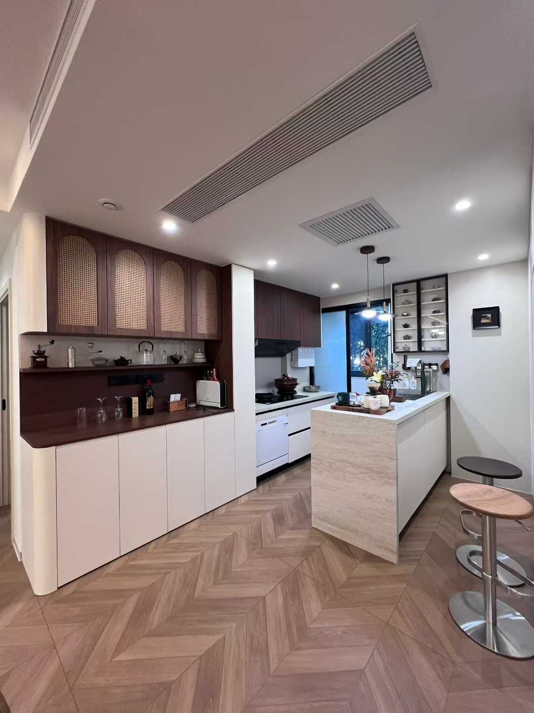 櫥柜采用米白 + 深棕配色,局部柜門加入藤編元素,增加自然質(zhì)感;玻璃柜展示茶具,嵌入式家電+ 集成吊頂,實用又整潔。