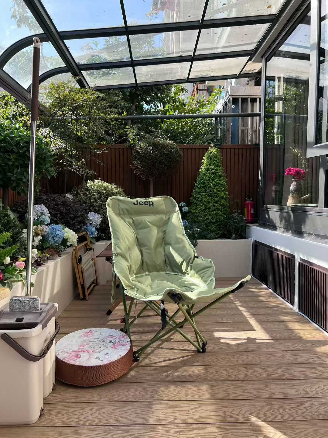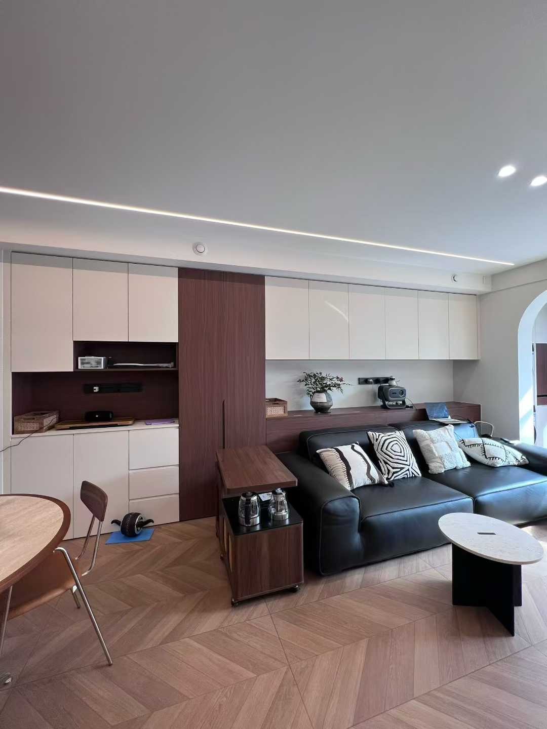 弧形門洞連接戶外花園,光線充足;頂面嵌入式線性燈 + 射燈,搭配人字拼木紋磚,簡約又有層次感;沙發(fā)抱枕的幾何圖案和藤編休閑椅,增加了細節(jié)質(zhì)感。