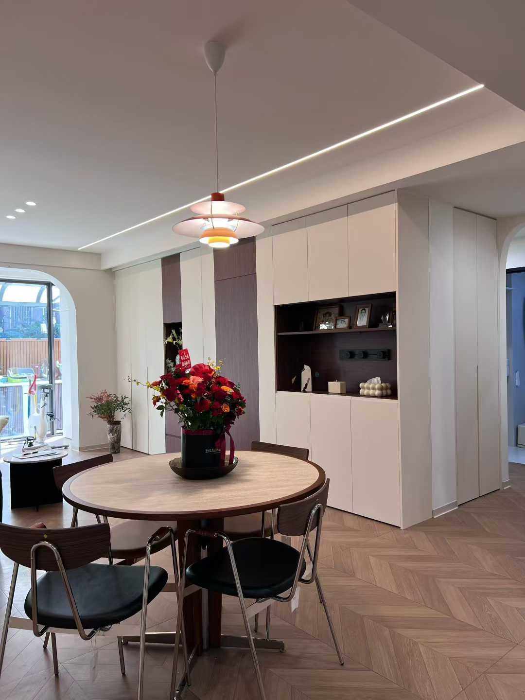 圓形餐桌配皮質(zhì)餐椅,旁邊是整面定制柜,兼顧收納與展示。
